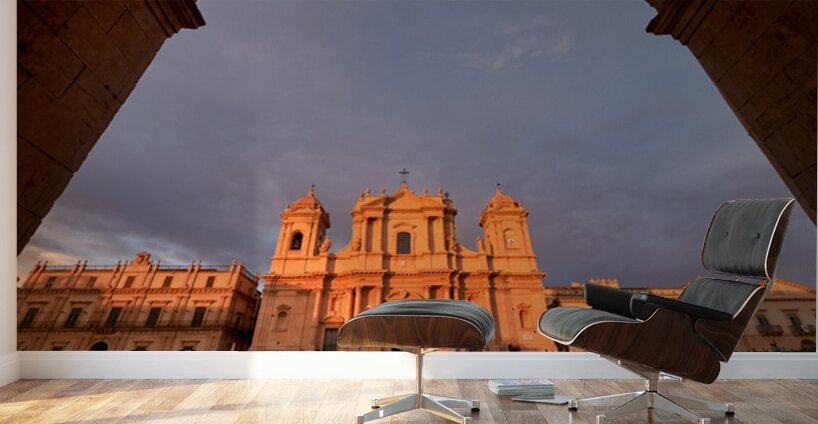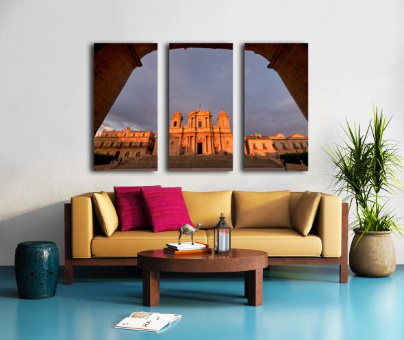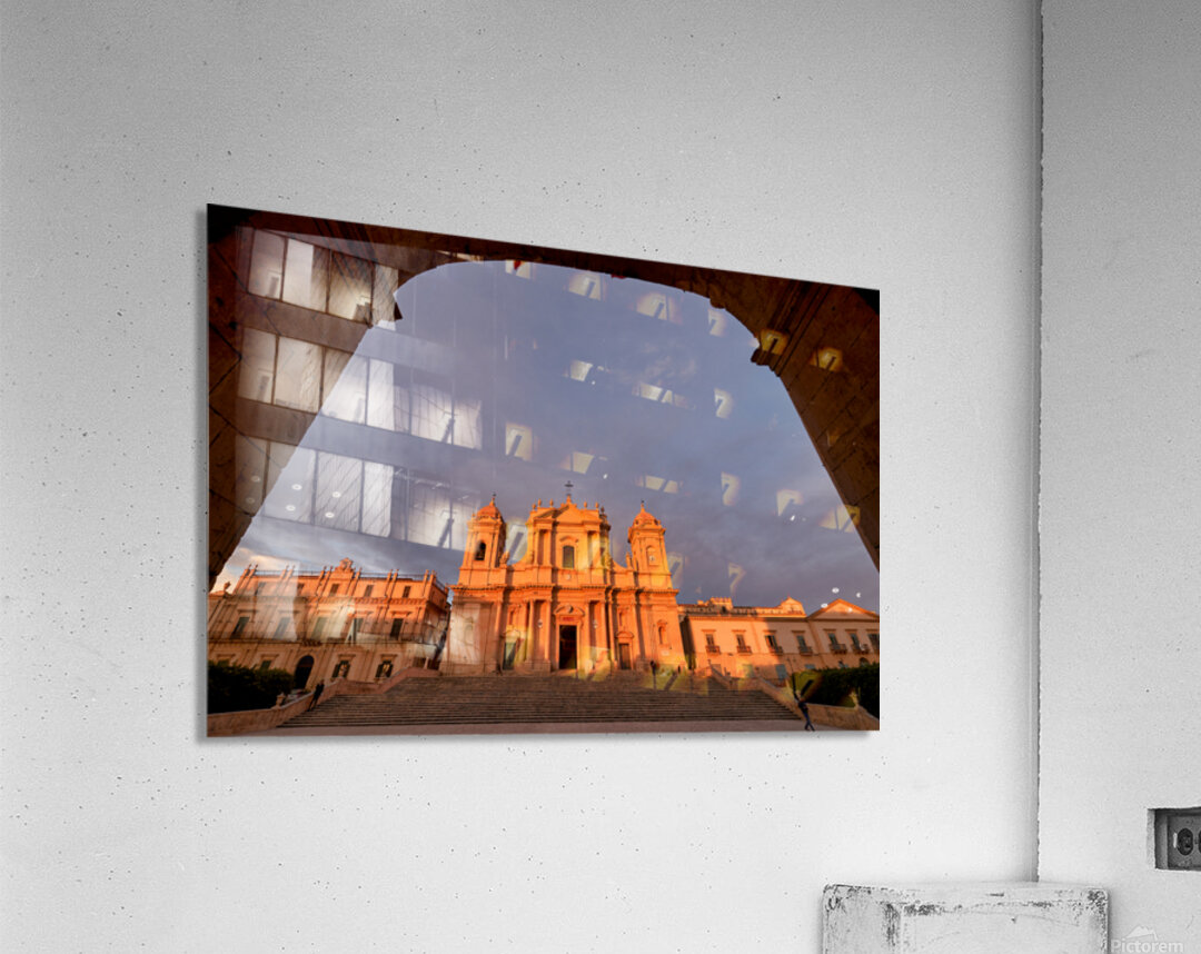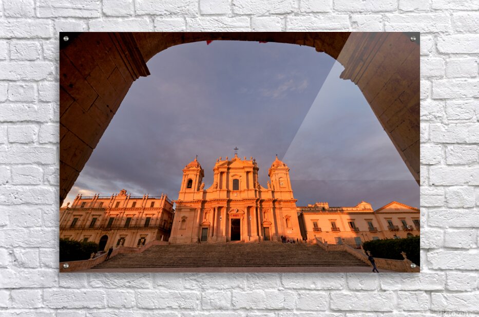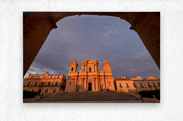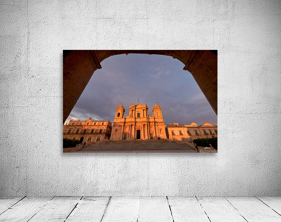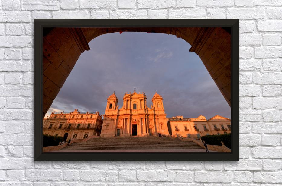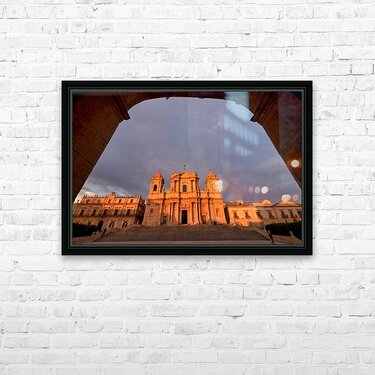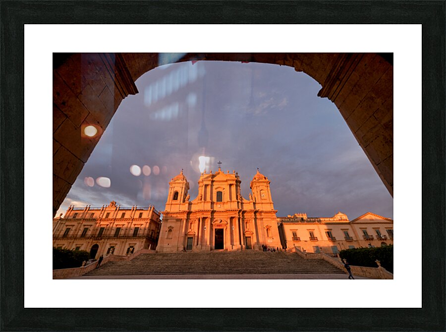 "Noto Cathedral in Sicily Italy during sunset with archway view" in a framed print.