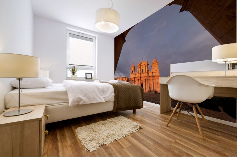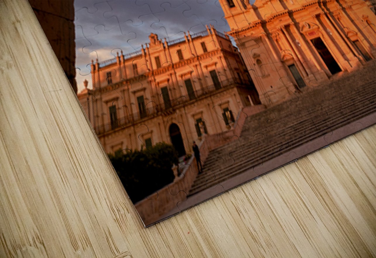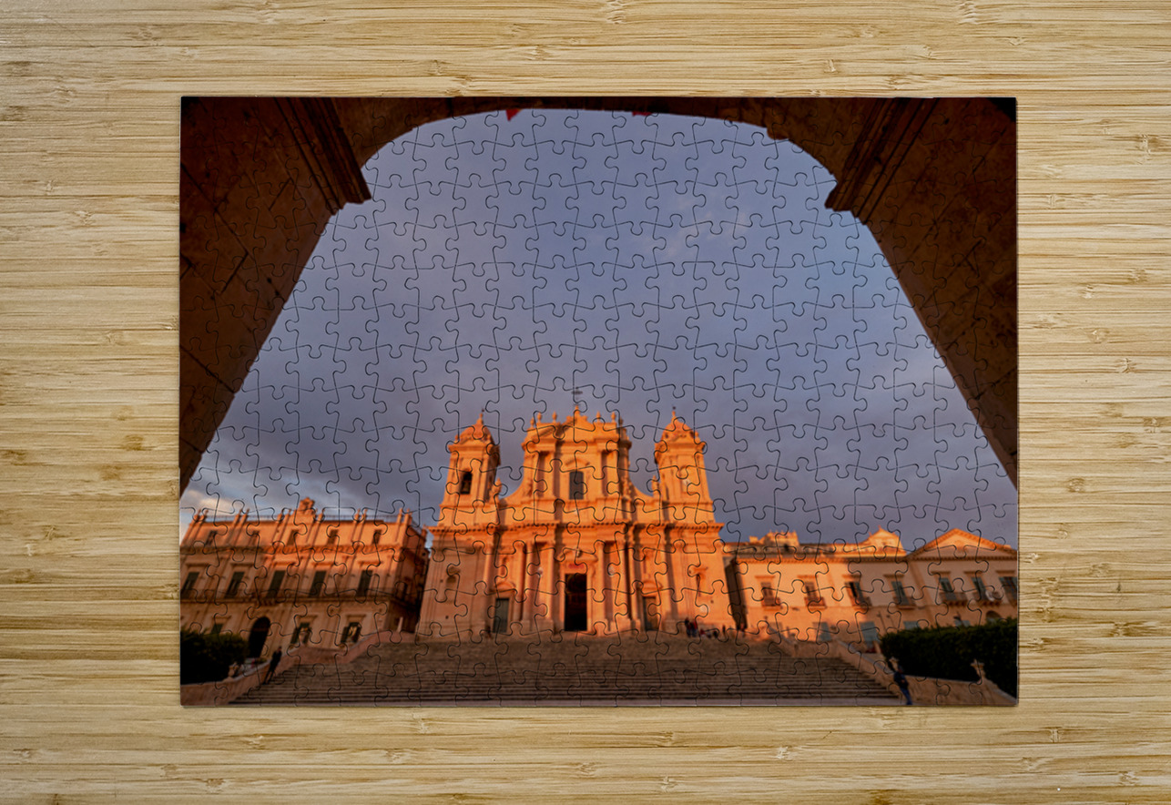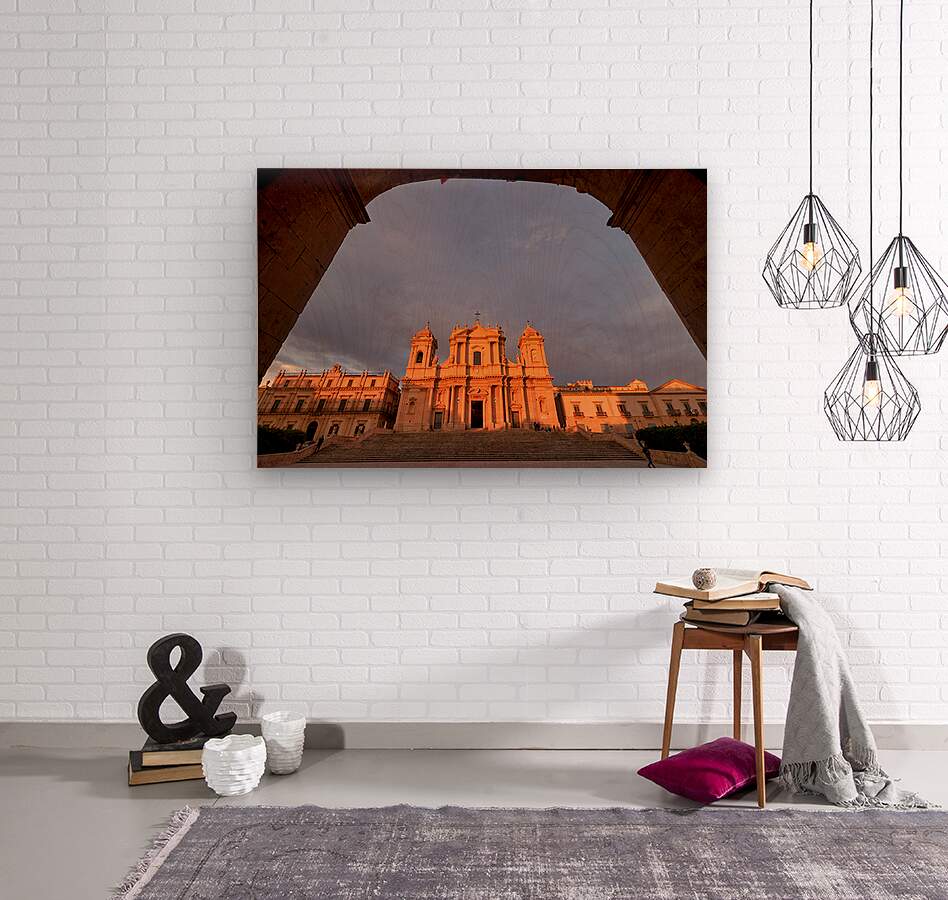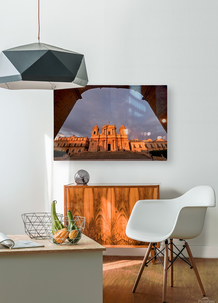 "Noto Cathedral in Sicily Italy during sunset with archway view" in a framed print.
