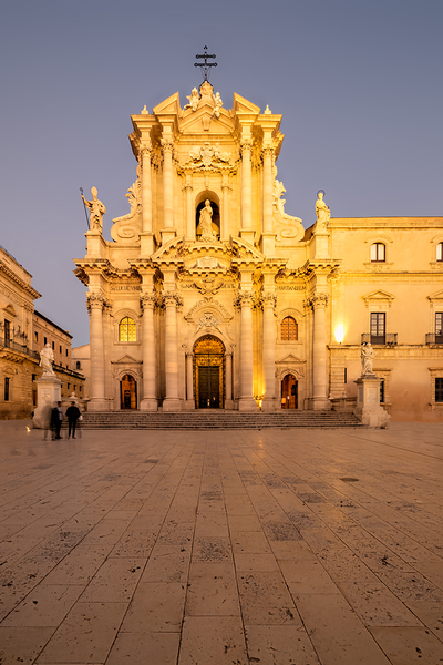 People walk near the Cathedral on Ortygia Island in Syracuse Sicily during the evening. The building is lit and looks historic.