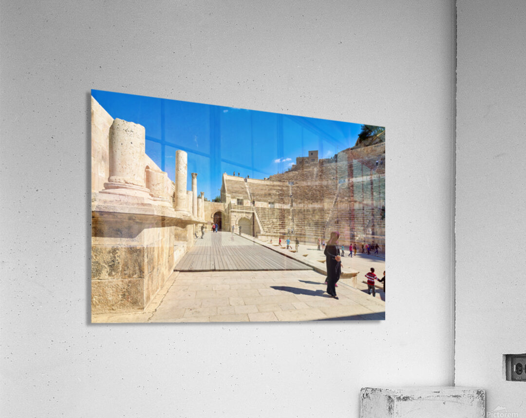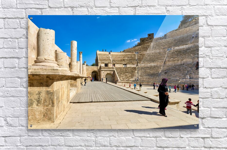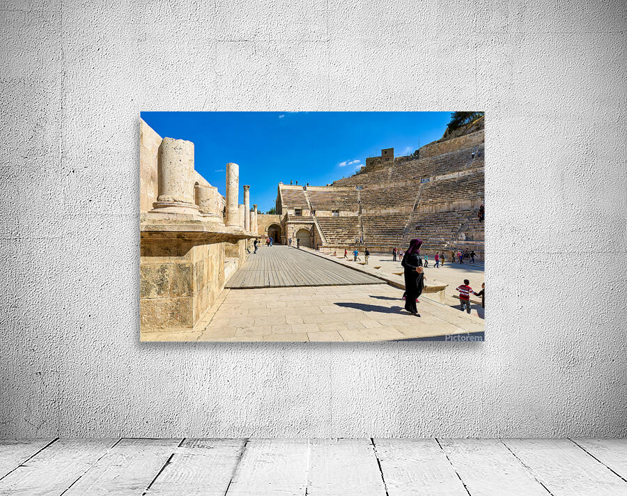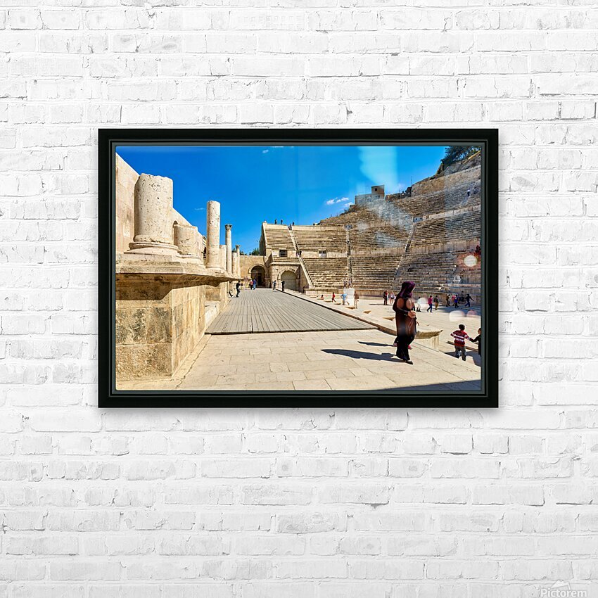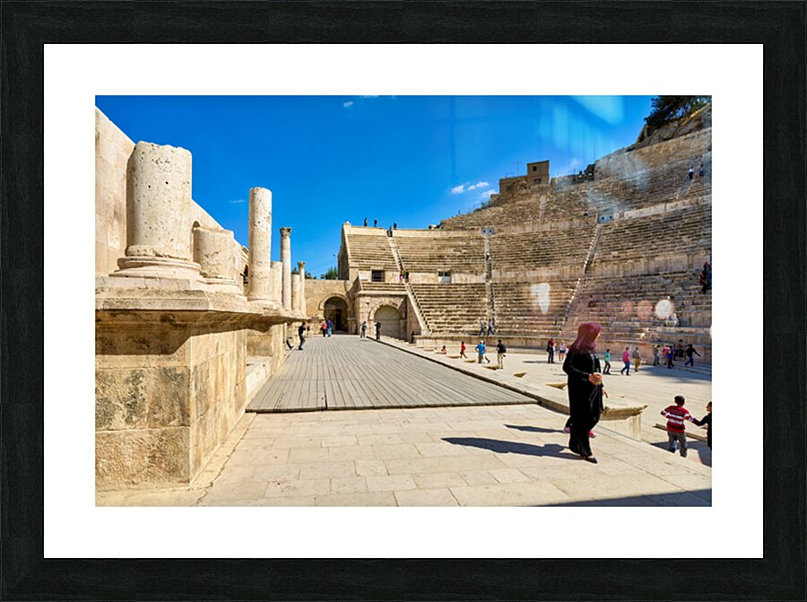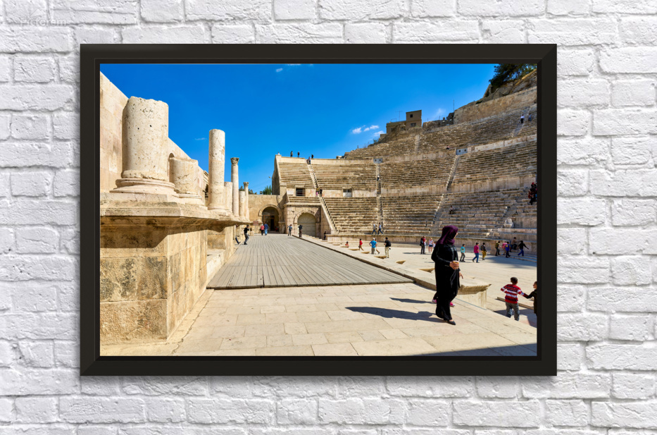 "Exploring the roman theater in amman jordan" in a framed print.