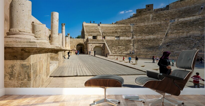 Visitors walk around the Roman Theater in Amman Jordan. The ancient structure showcases tiers of seats and historical ruins.