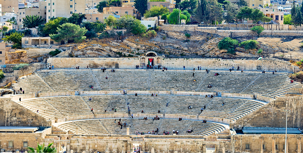 People are exploring the Roman Theater in Amman Jordan. The ancient structure shows many rows of seats and stone walls.