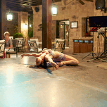 A dancer performs belly dance on stage while an audience watches in a local venue in Jordan during the evening.