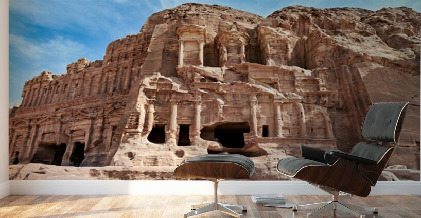 Visitors explore the Urn Tomb part of the Royal Tombs in Petra Jordan surrounded by ancient stone structures and desert landscape.