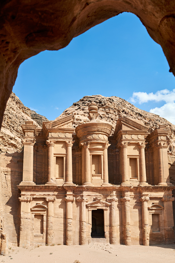 Visitors explore the Ad Deir Monastery at Petra in Jordan. The large stone structure stands tall against a clear blue sky.