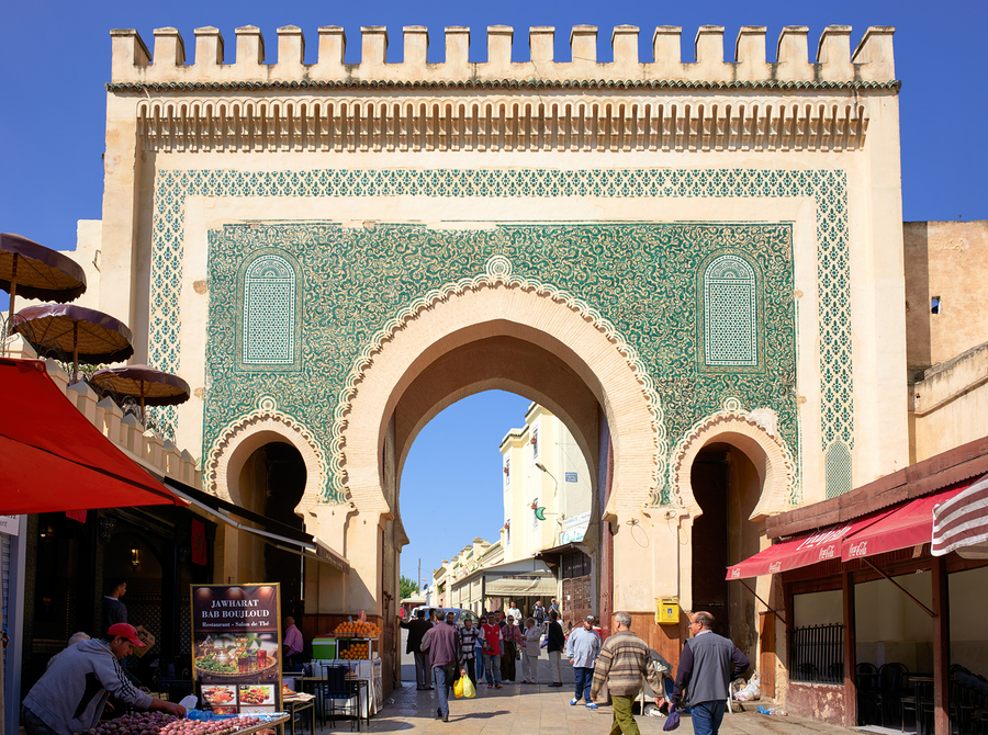 People walk through Bab Bou Jeloud the blue gate of Medina in Fez. Shops line the streets as visitors explore the area during the day.