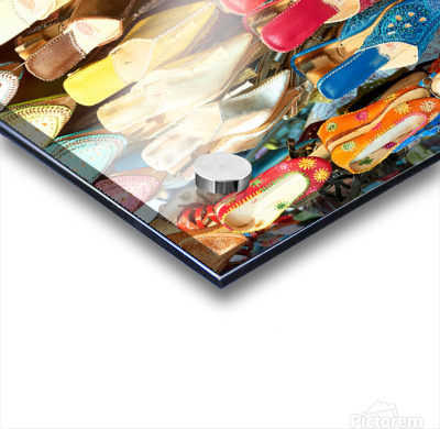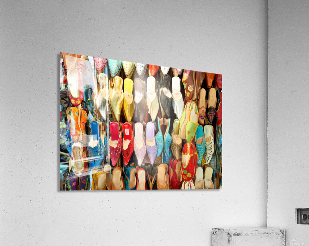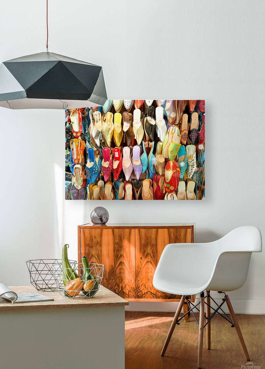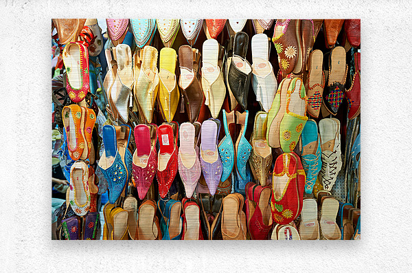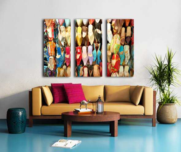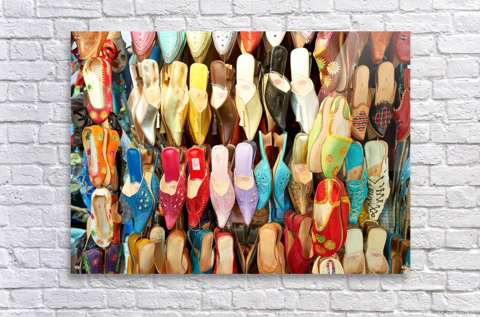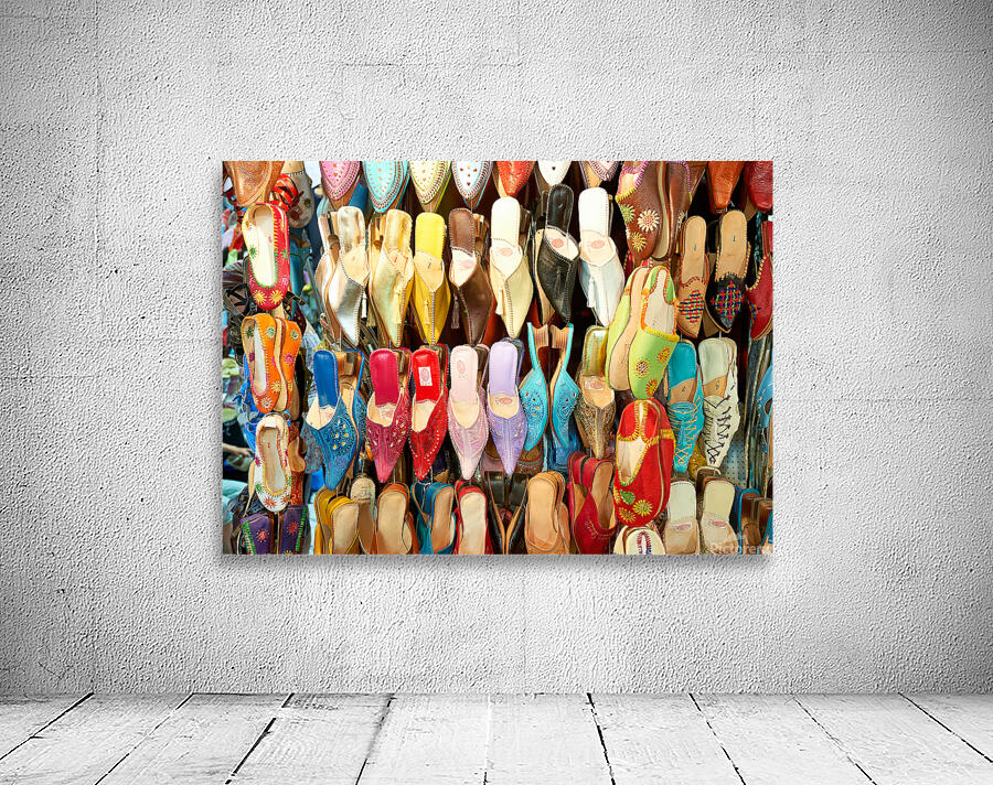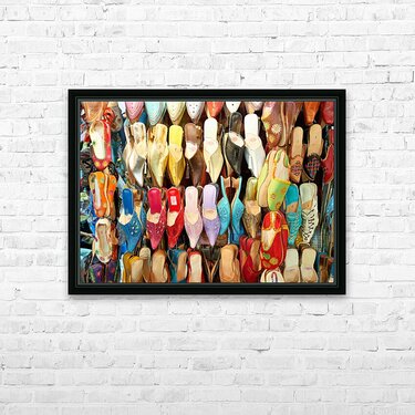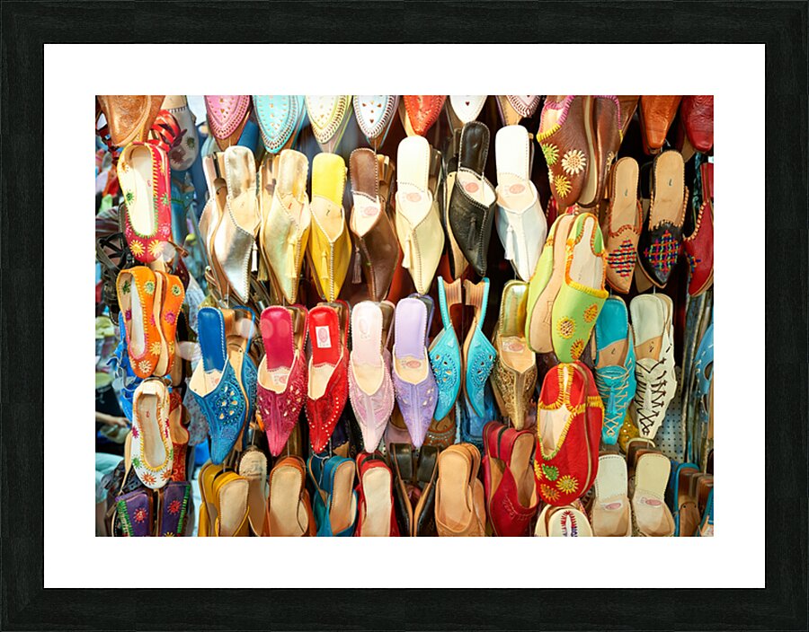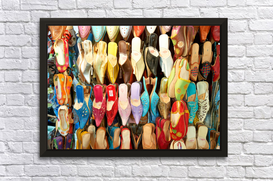 "Traditional Moroccan slippers on display in Marrakesh market" in a framed print.