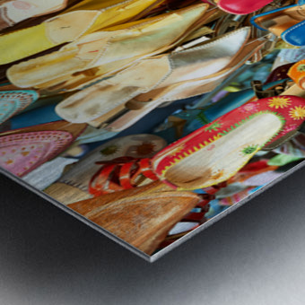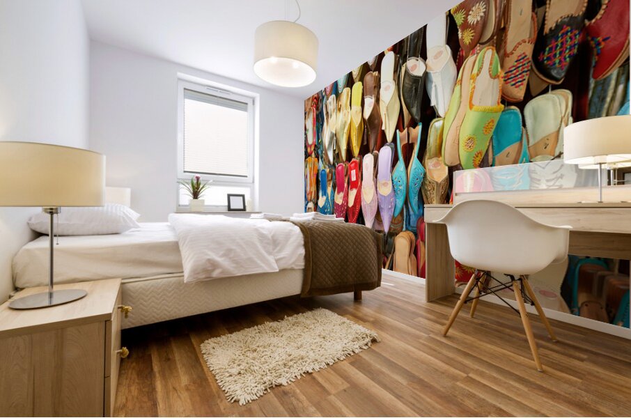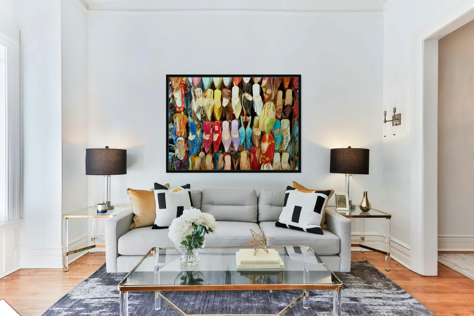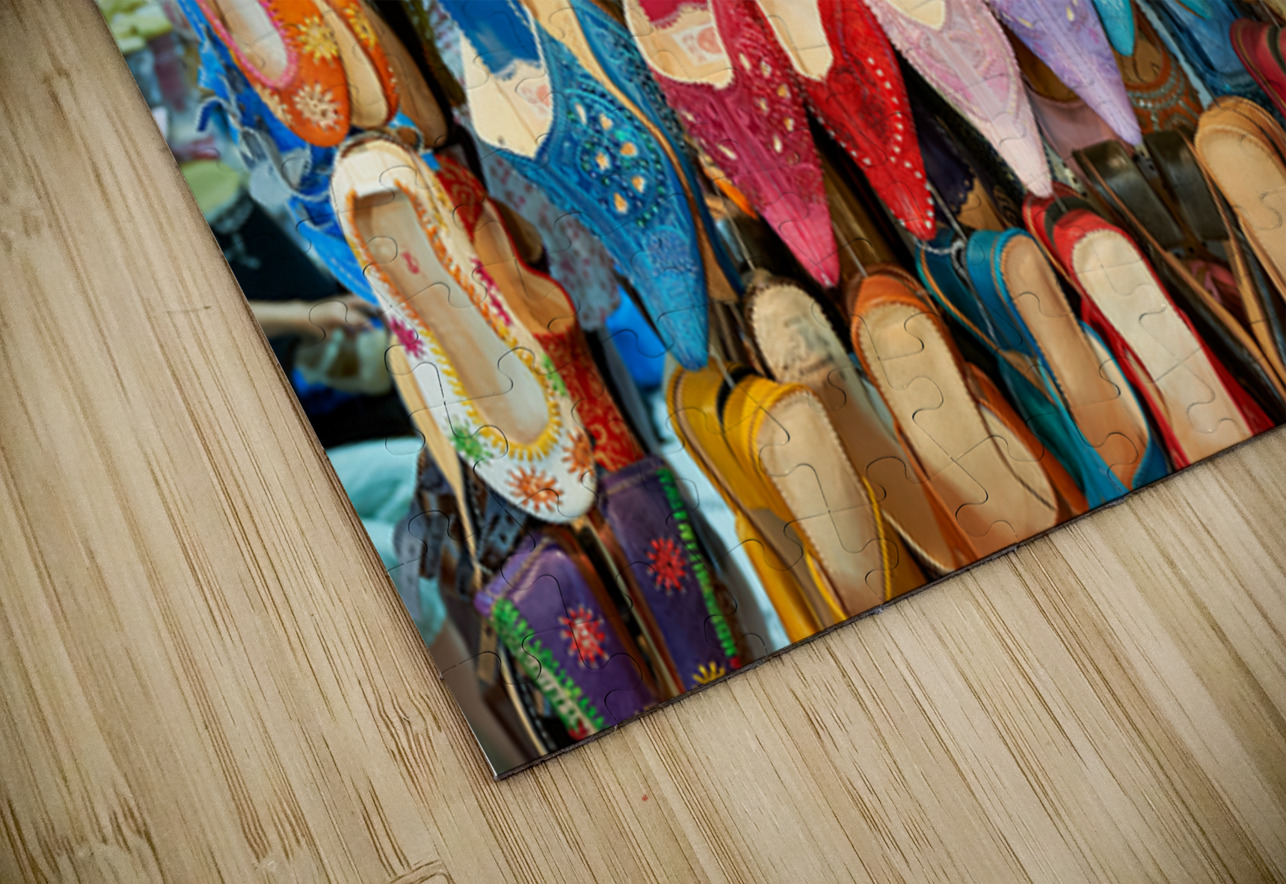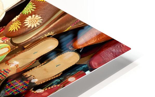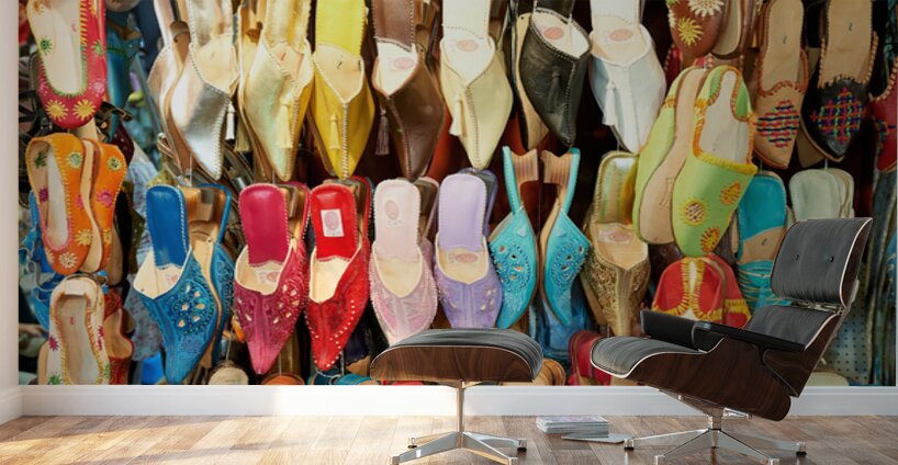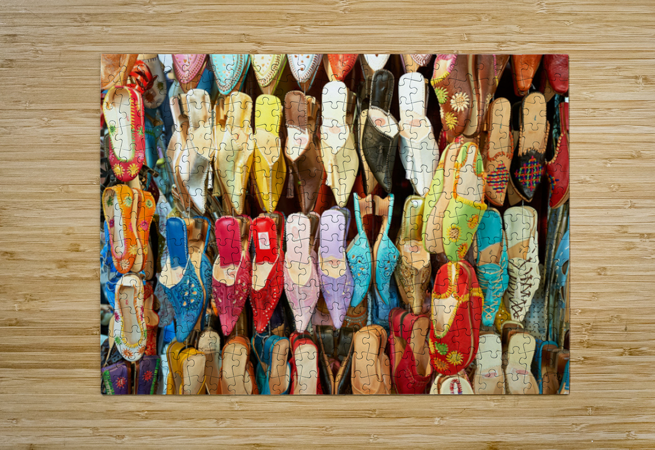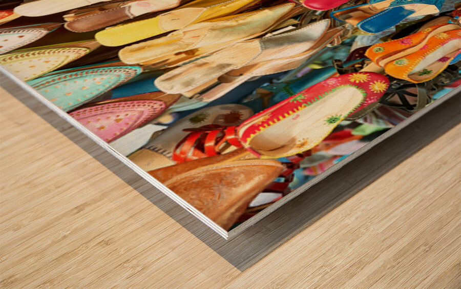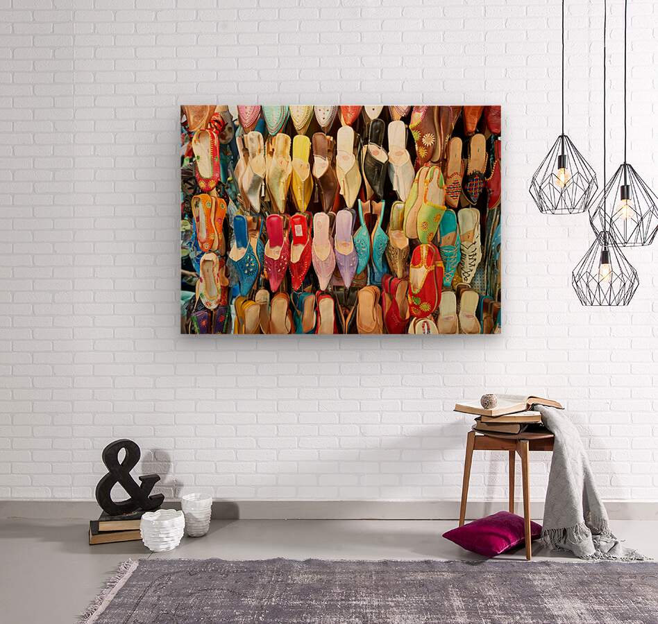 "Traditional Moroccan slippers on display in Marrakesh market" in a framed print.