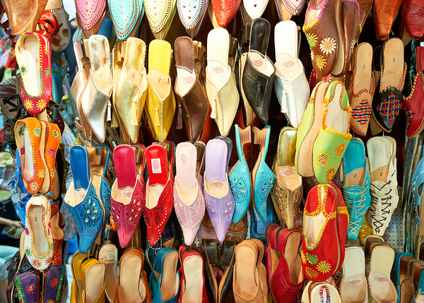 Visitors browse colorful Moroccan slippers arranged neatly in a market in Marrakesh.