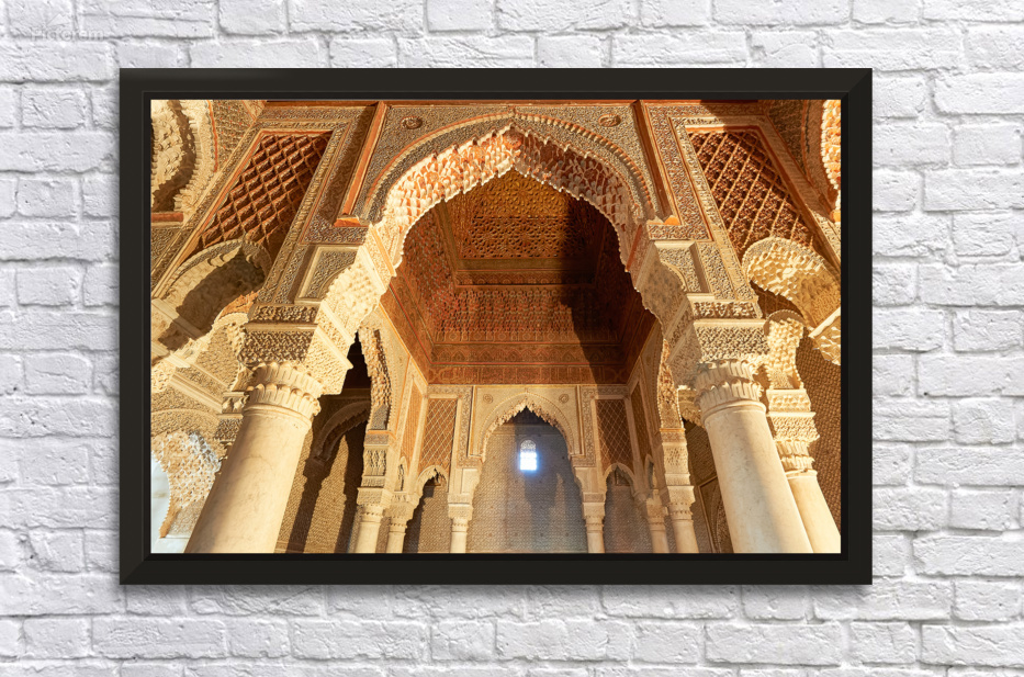 "Exploring Saadian tombs in Marrakesh Morocco" in a framed print.
