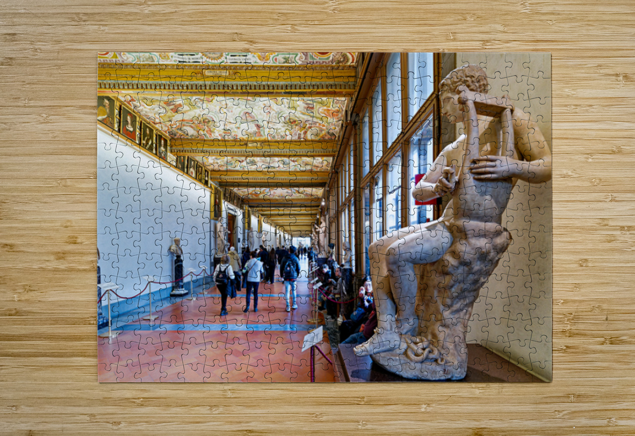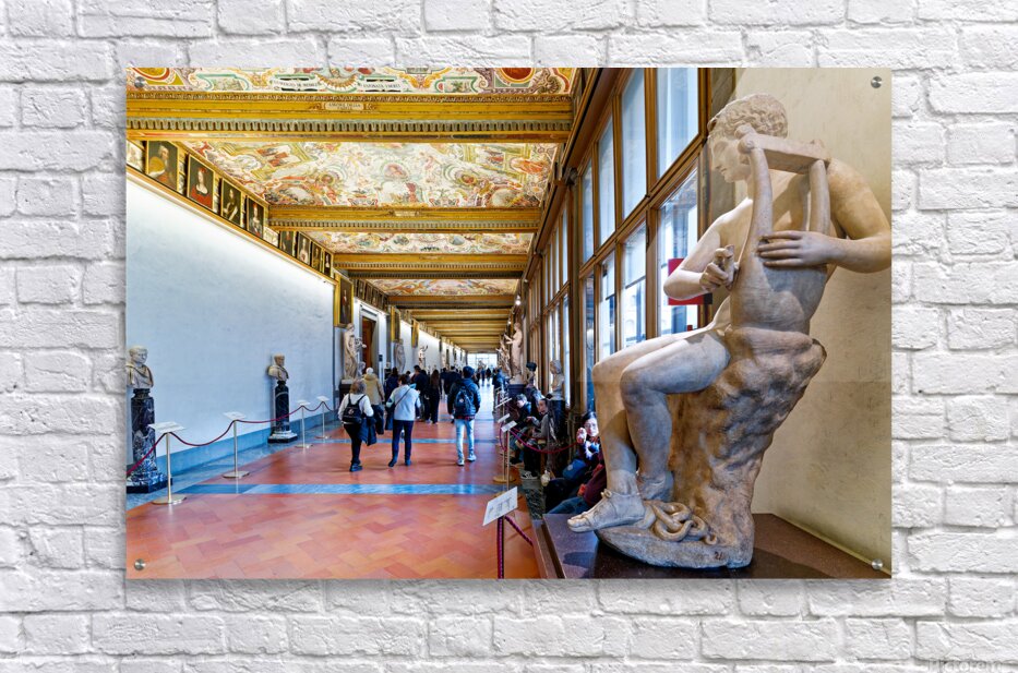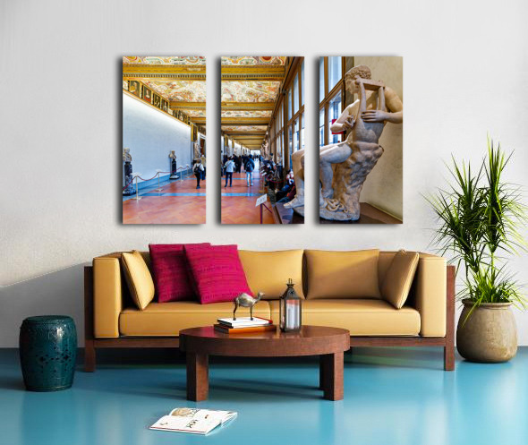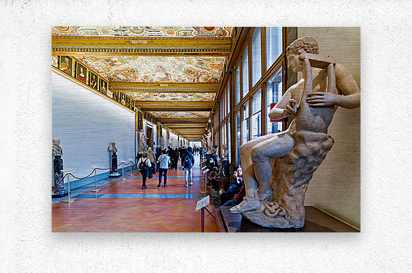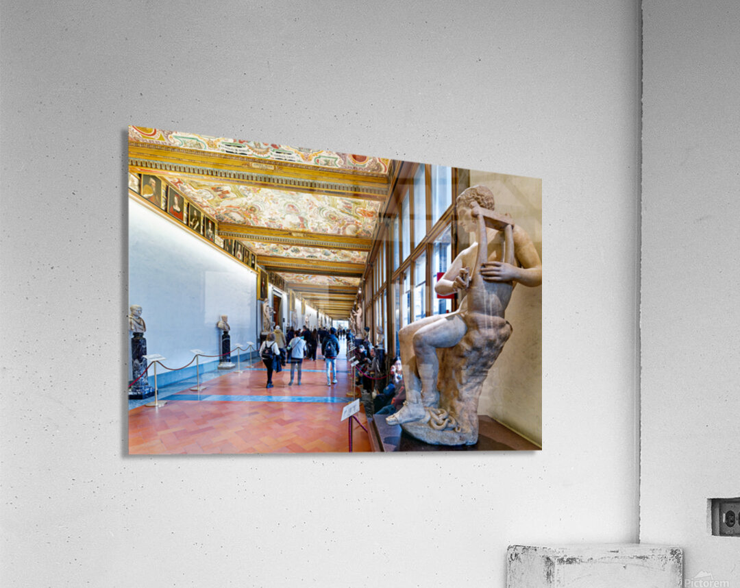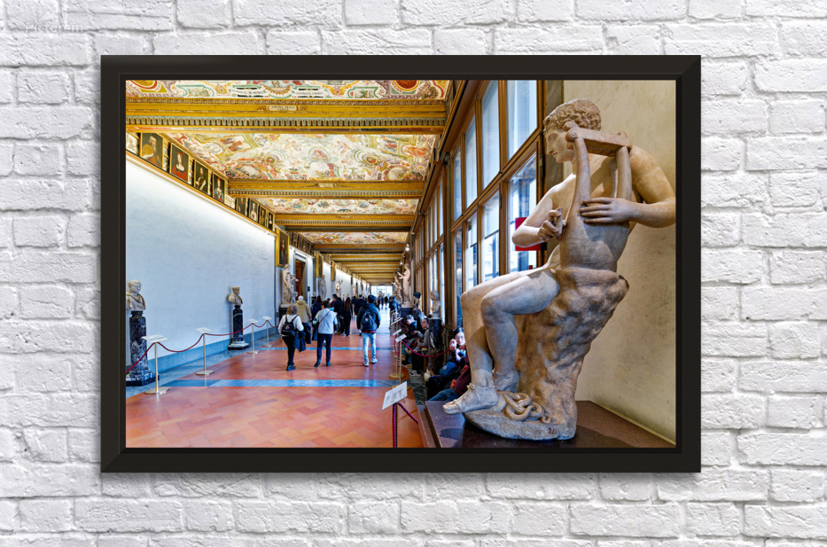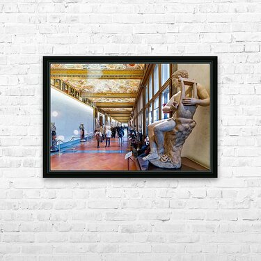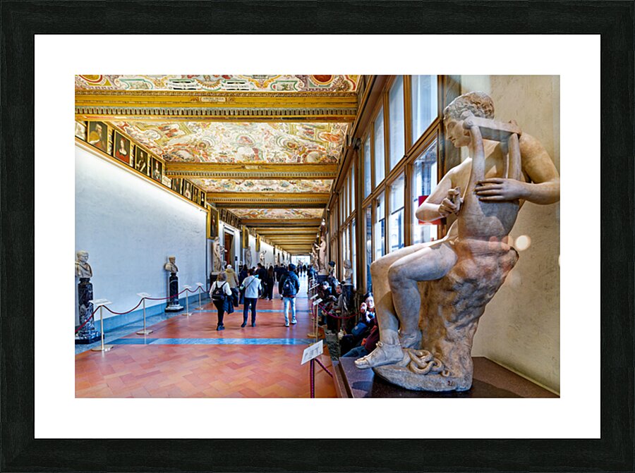 "Visit to Uffizi Gallery in Florence with sculptures and visitors" in a framed print.
