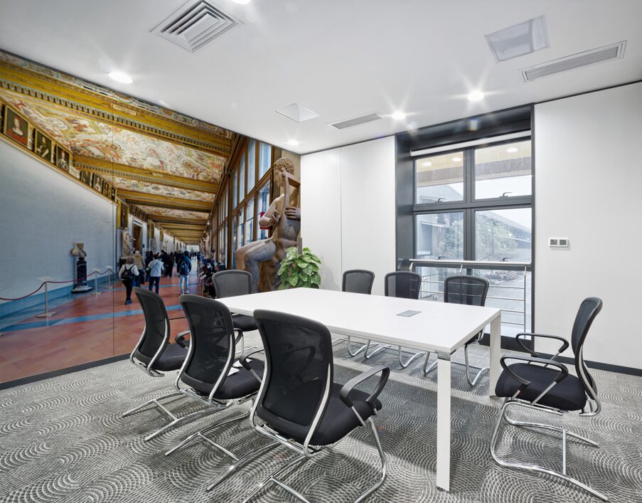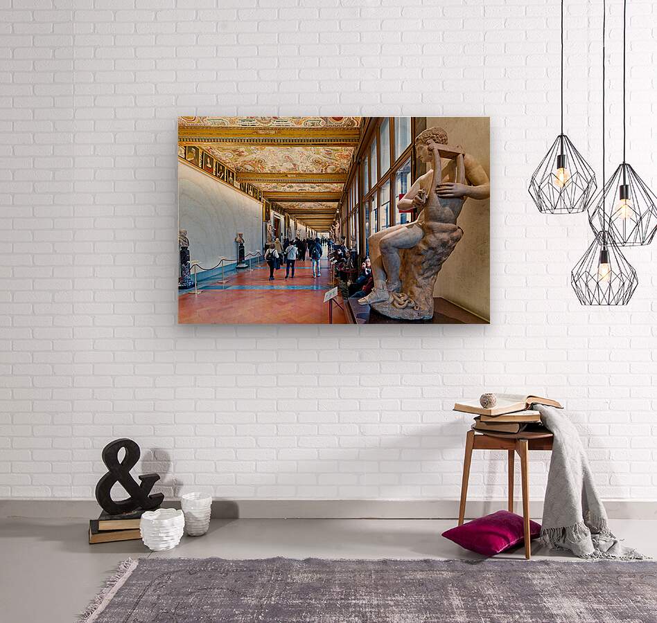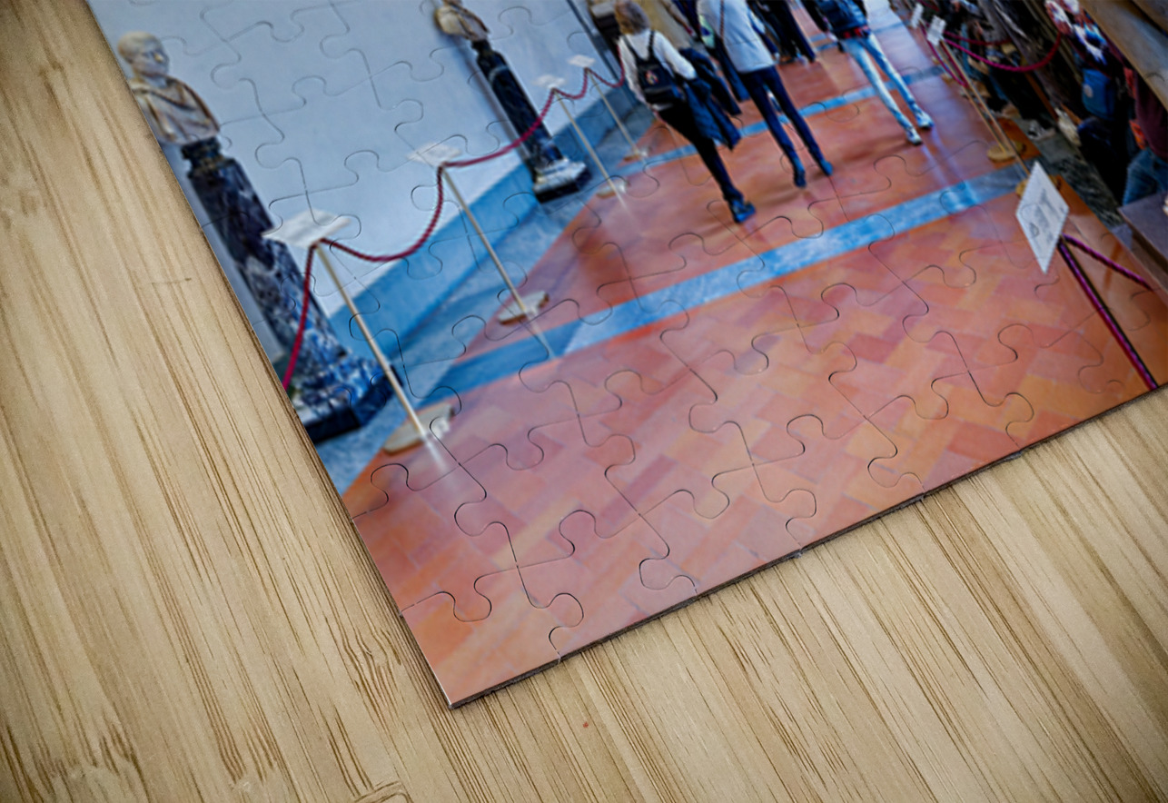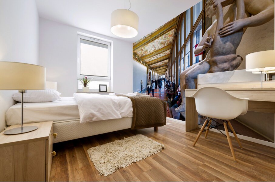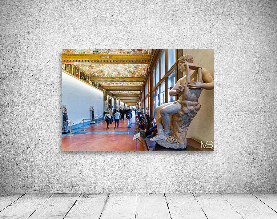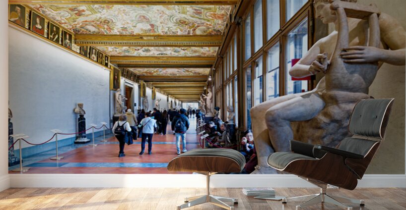 "Visit to Uffizi Gallery in Florence with sculptures and visitors" in a framed print.