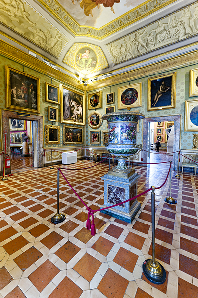 Visitors explore the Palatine Gallery in Palazzo Pitti viewing art and historical items. The walls are lined with multiple artworks and decorations.