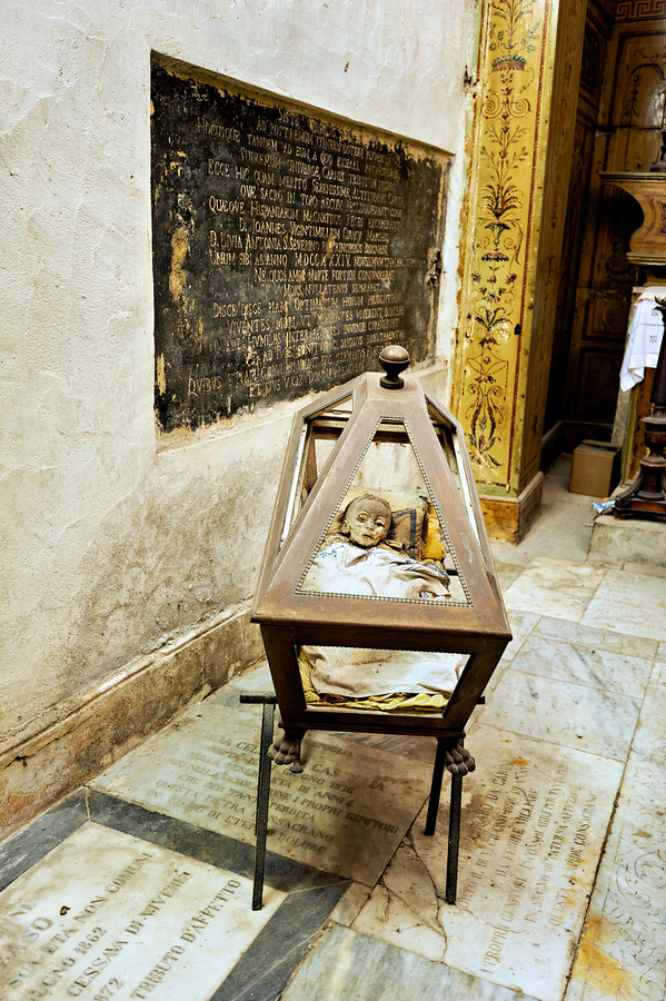 Visitors walk among mummies and artifacts in the Capuchin Catacombs in Palermo. This site shows history and culture from past times in Sicily.