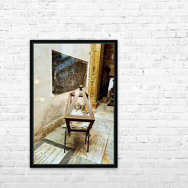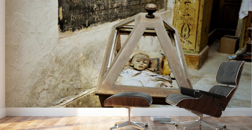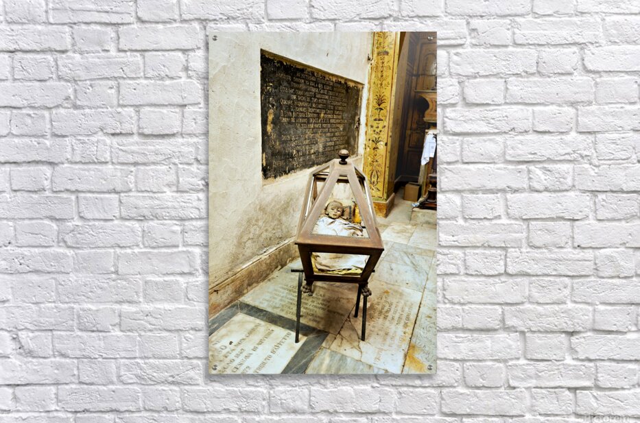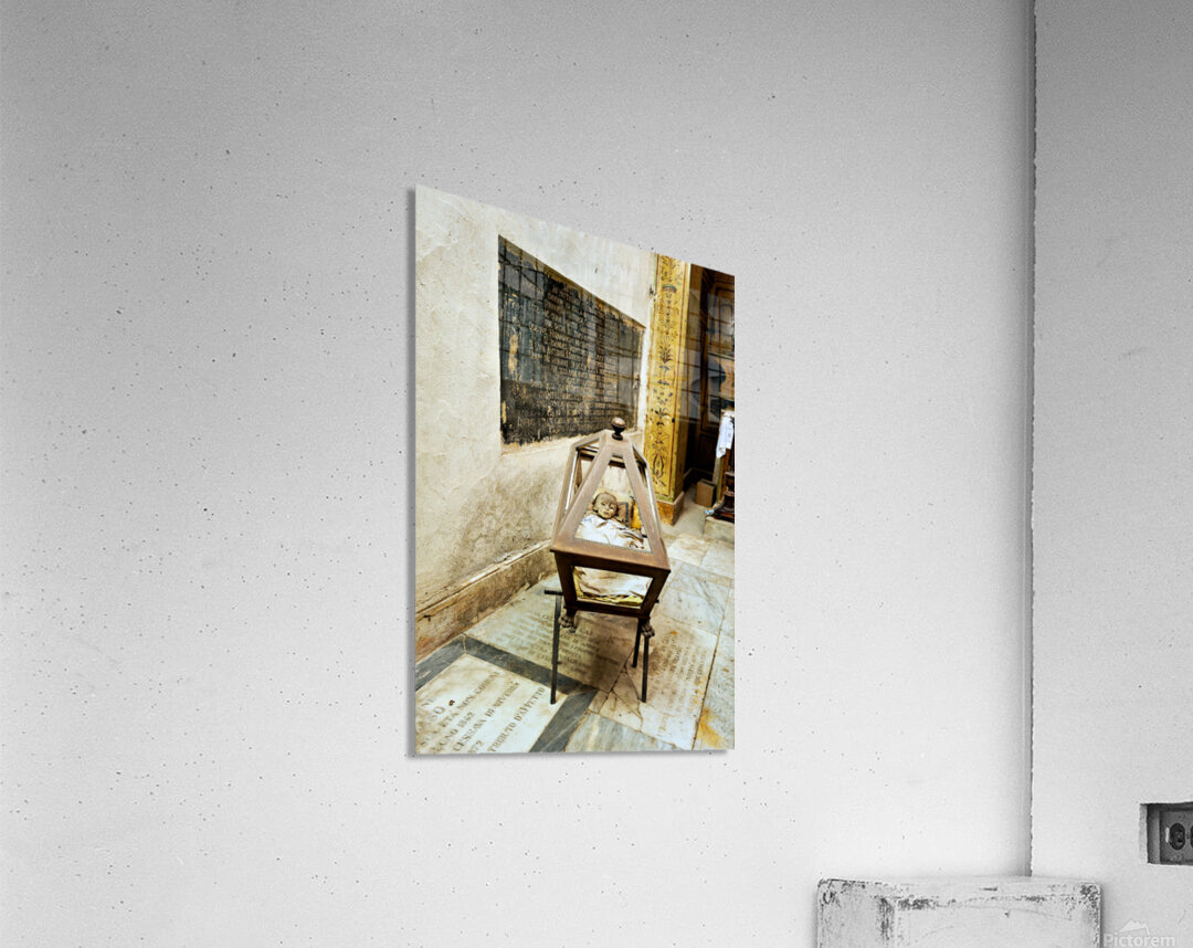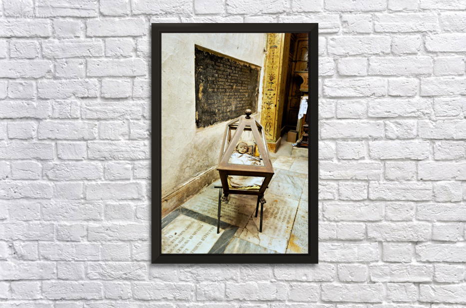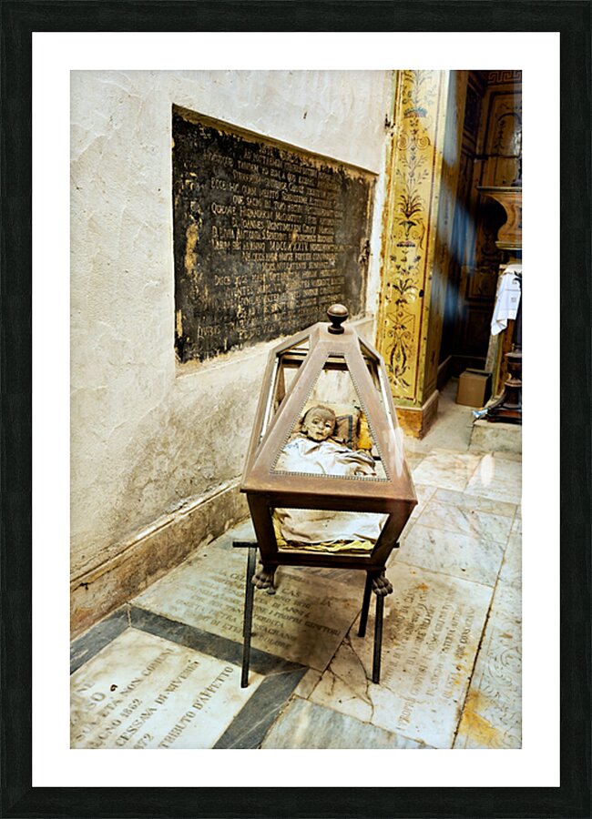 "Exploring the capuchin catacombs in palermo sicily italy" in a framed print.