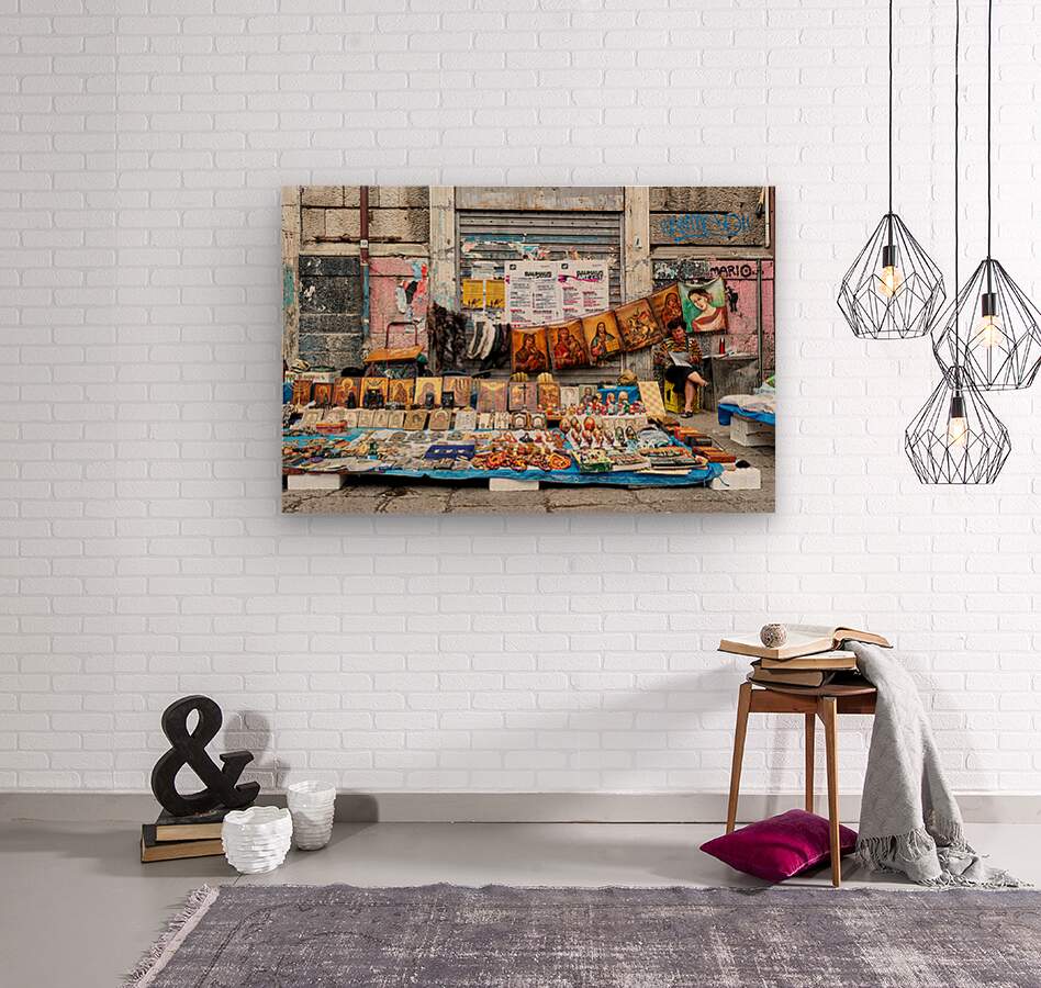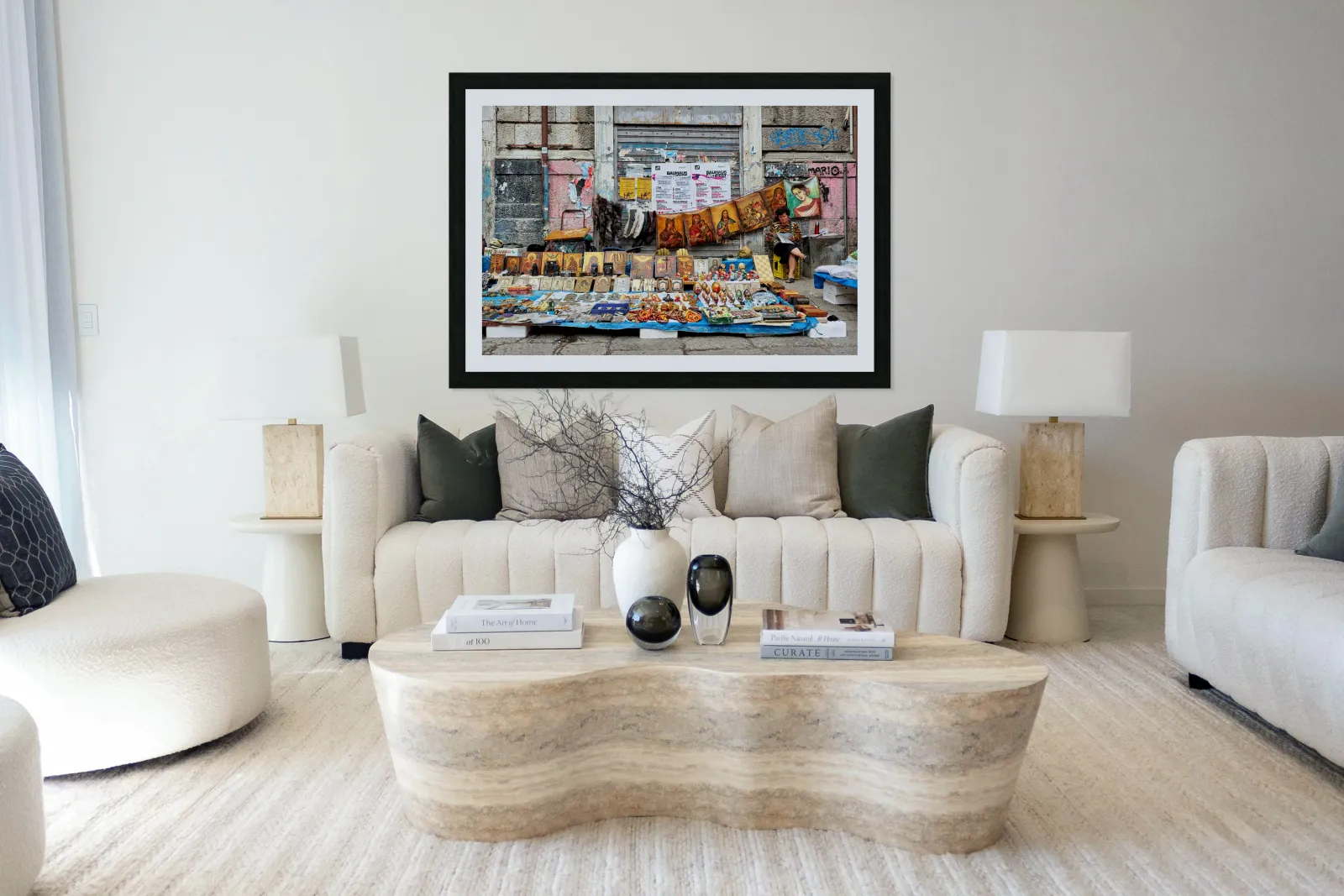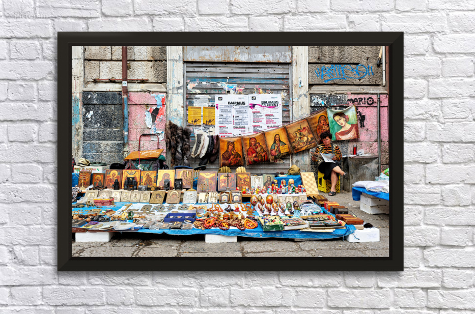 "Market scene in Palermo Sicily with local crafts and art" in a framed print.
