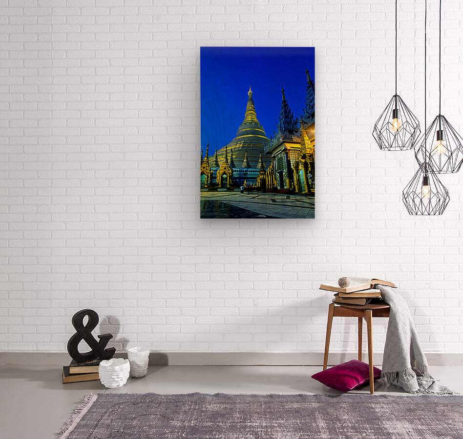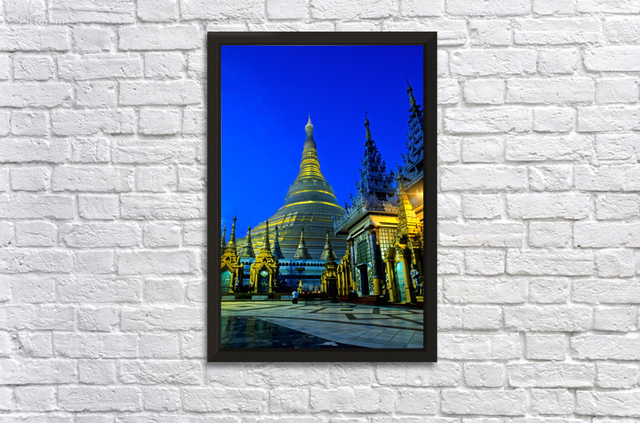 "Popular Schwedagon Paya at night in Yangon Myanmar" in a framed print.