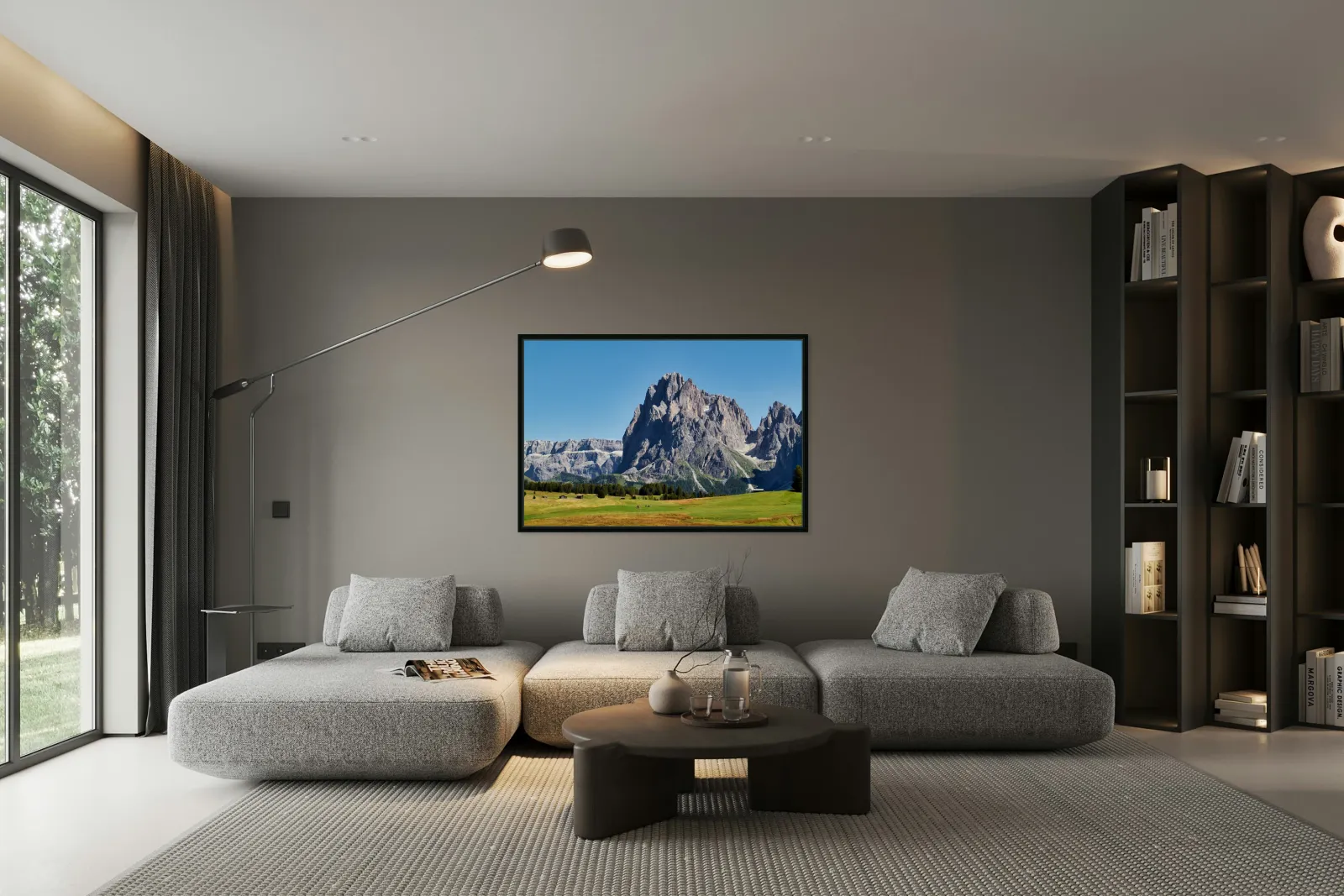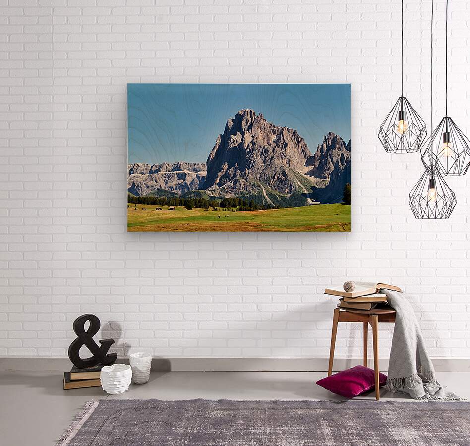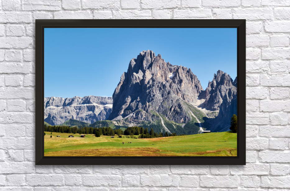"Sassolungo mountain peak view at Seiser Alm in Italy" in a framed print.
