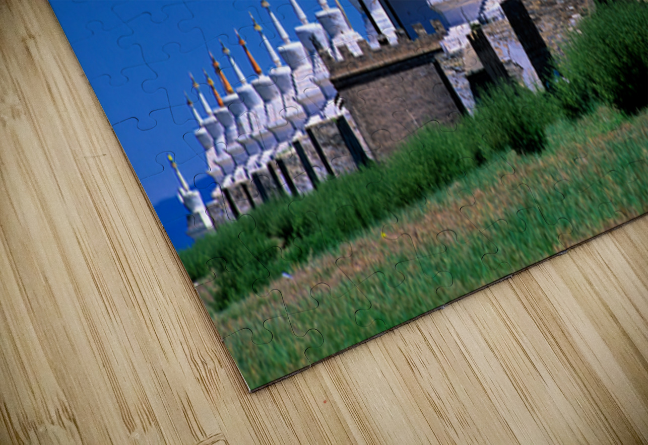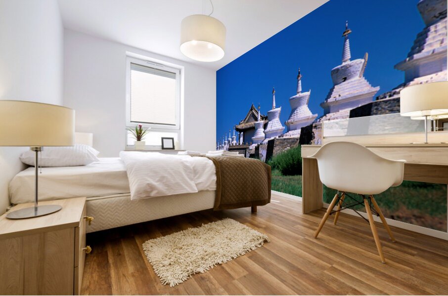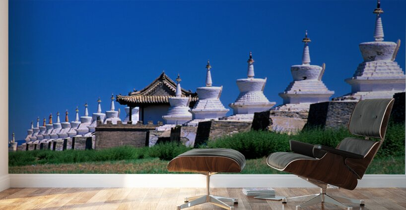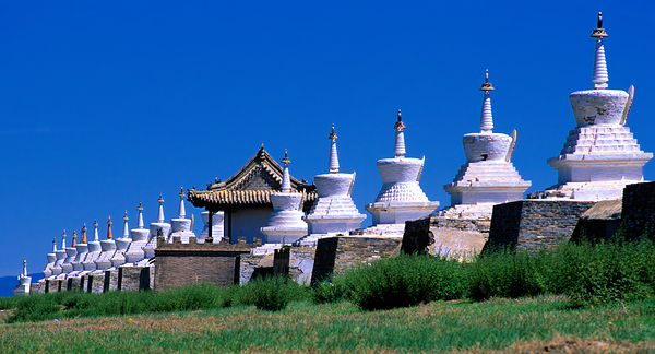 Visitors can see the ancient Erdene Zuu Monastery with its white stupas and blue sky in Mongolia. It is a major site for Buddhist practice.