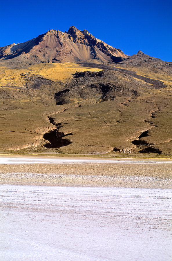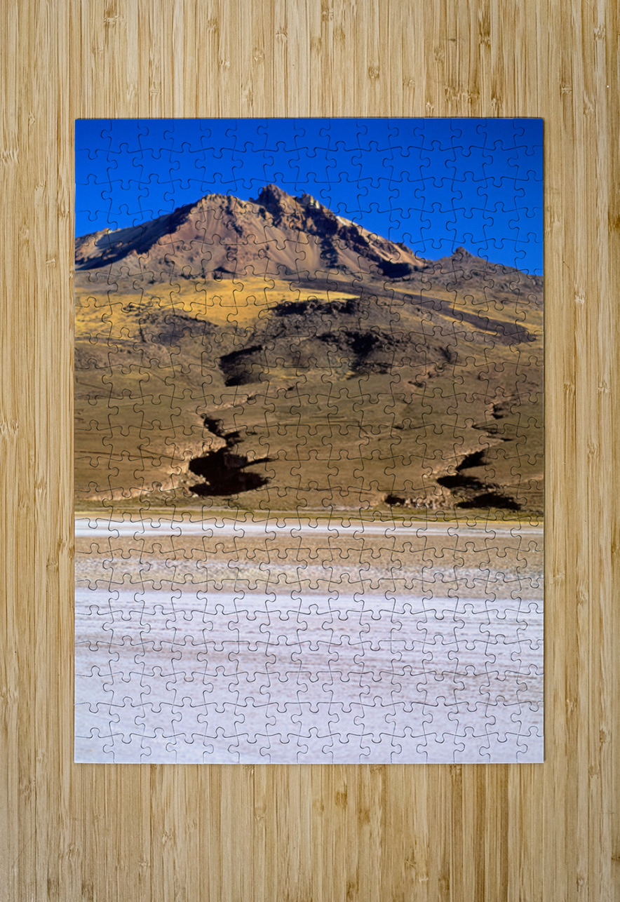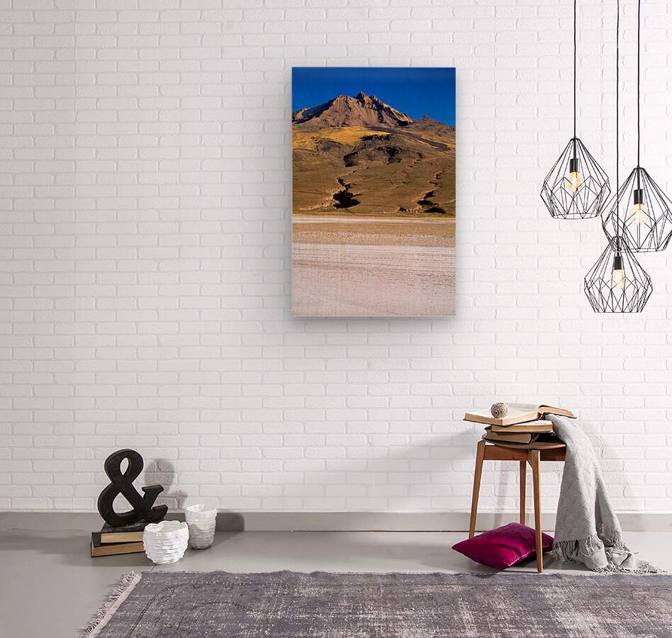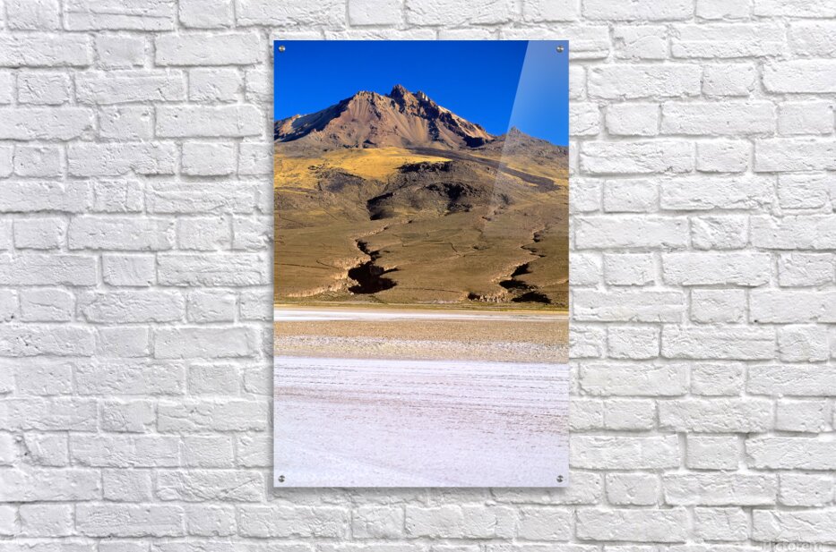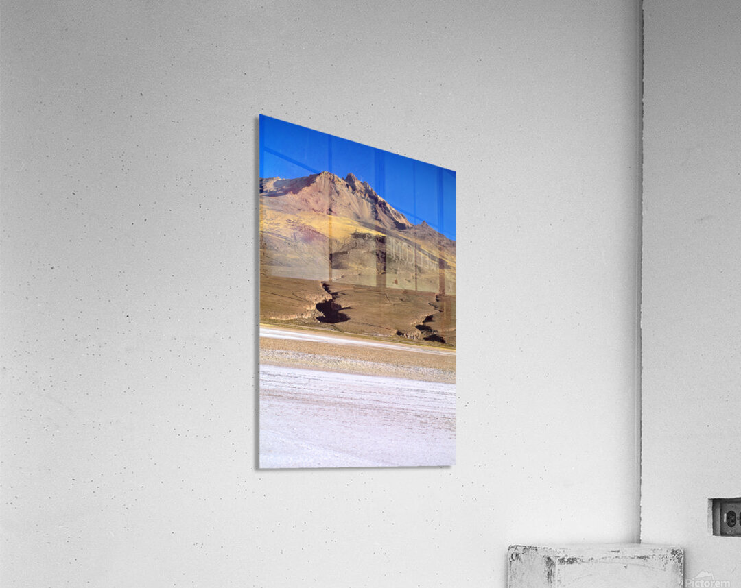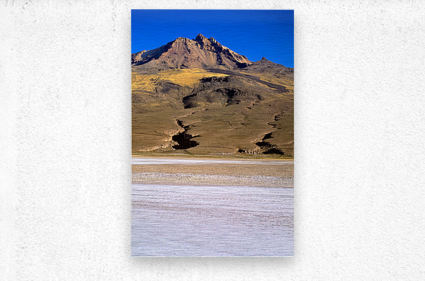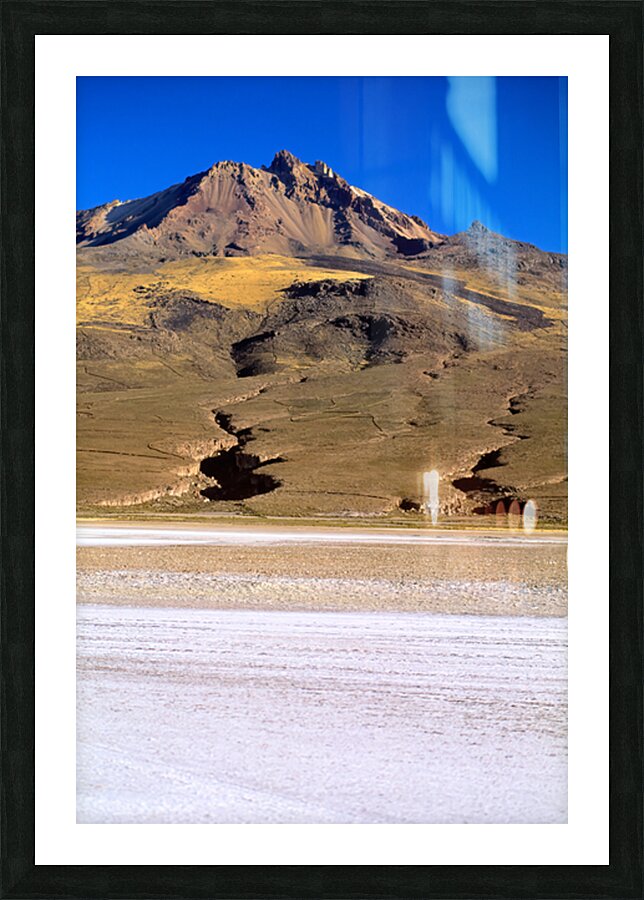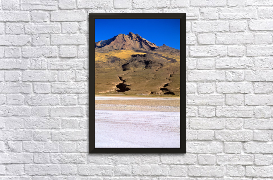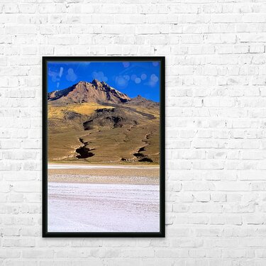 "Mountain overlooks vast salt flat under clear blue sky." in a framed print.