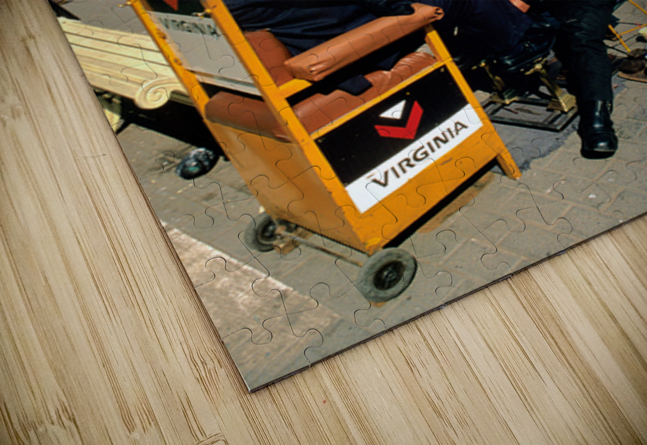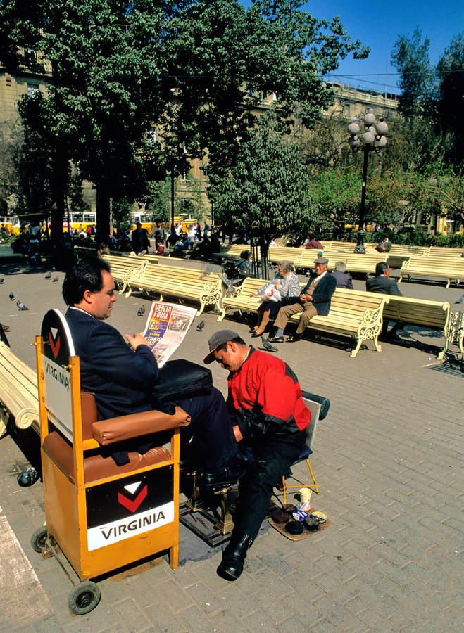 A businessman reads a newspaper while a shoeshiner polishes his shoes on a Virginia stand in a lively city park providing a convenient service.