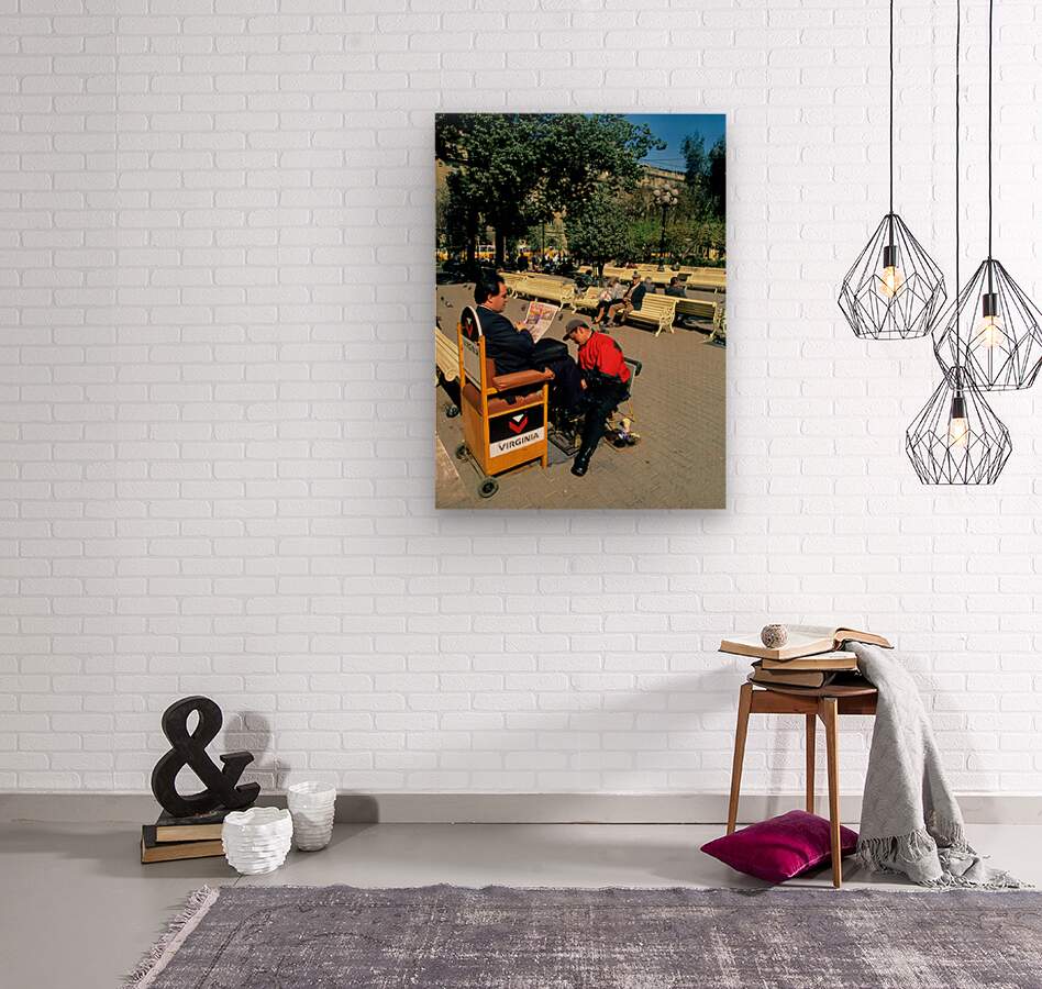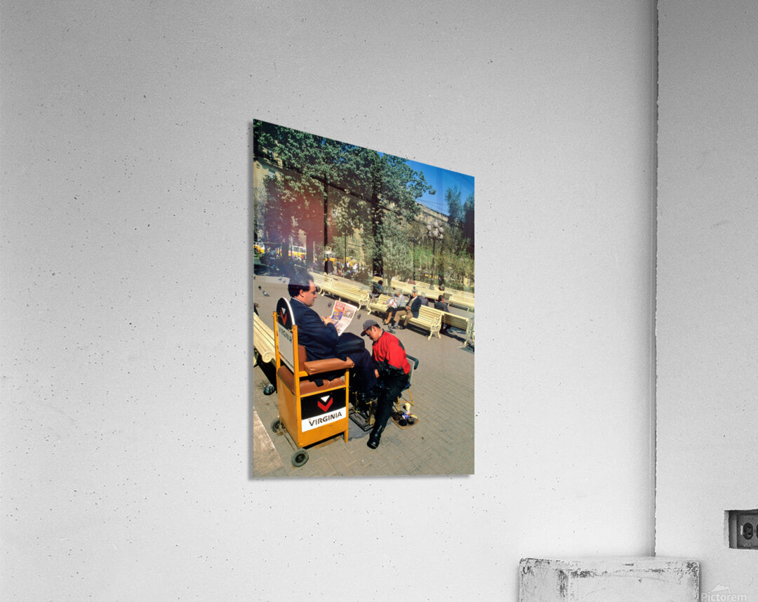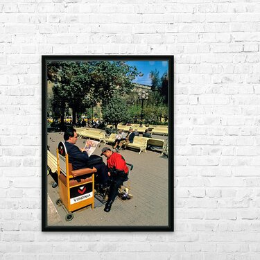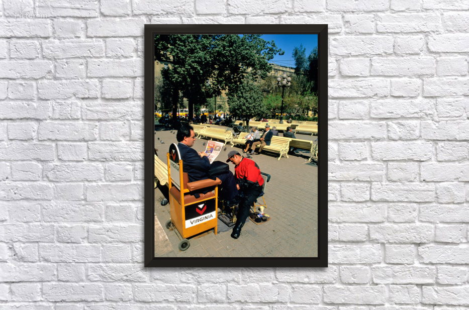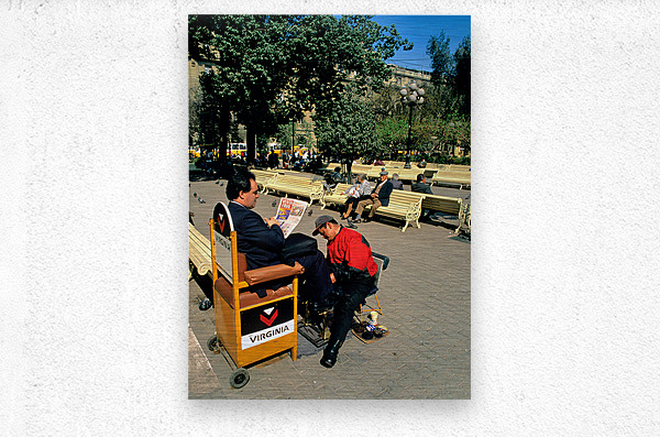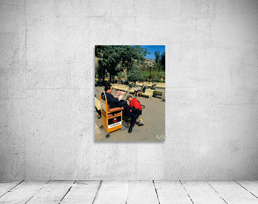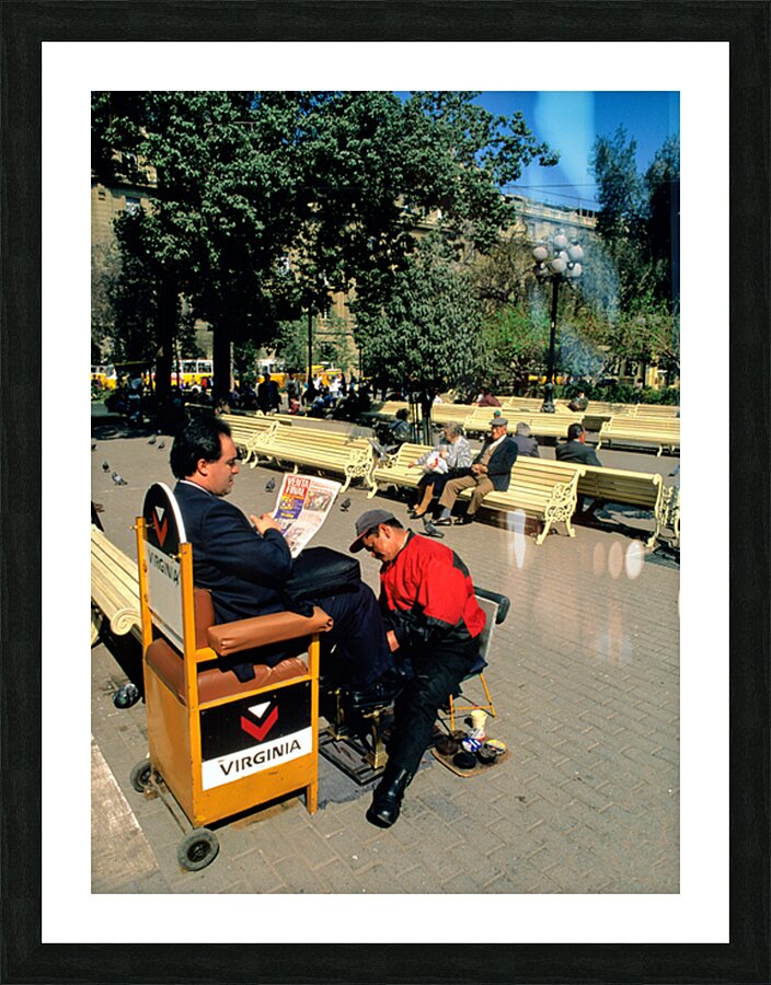 "Man gets shoeshine in park while reading newspaper." in a framed print.