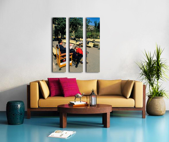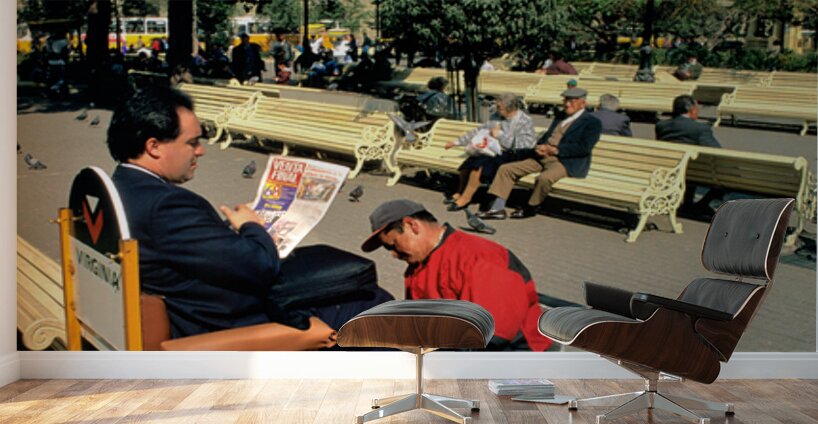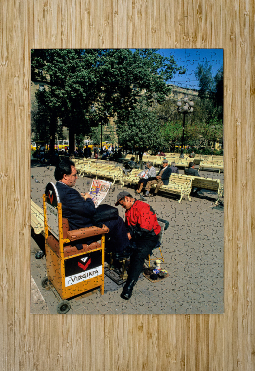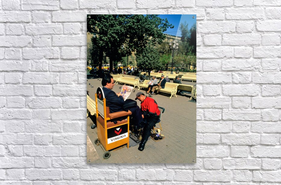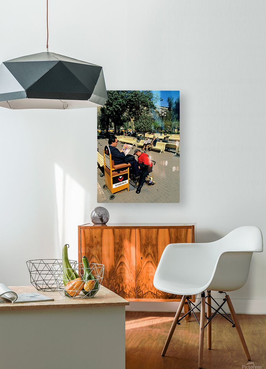 "Man gets shoeshine in park while reading newspaper." in a framed print.