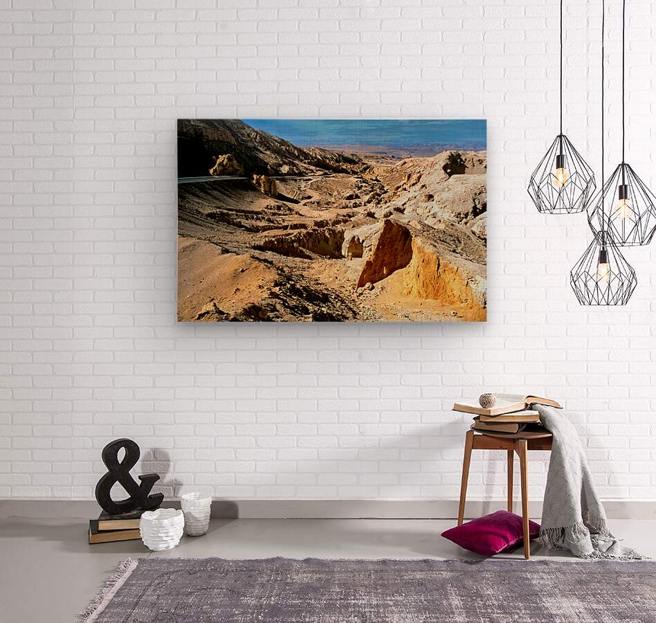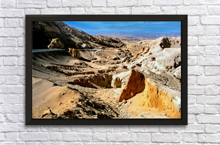 "Dramatic arid mountain landscape with a winding road." in a framed print.