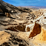 A winding road cuts through the dramatic eroded desert landscape of the Atacama Desert Chile showcasing its unique geological formations.