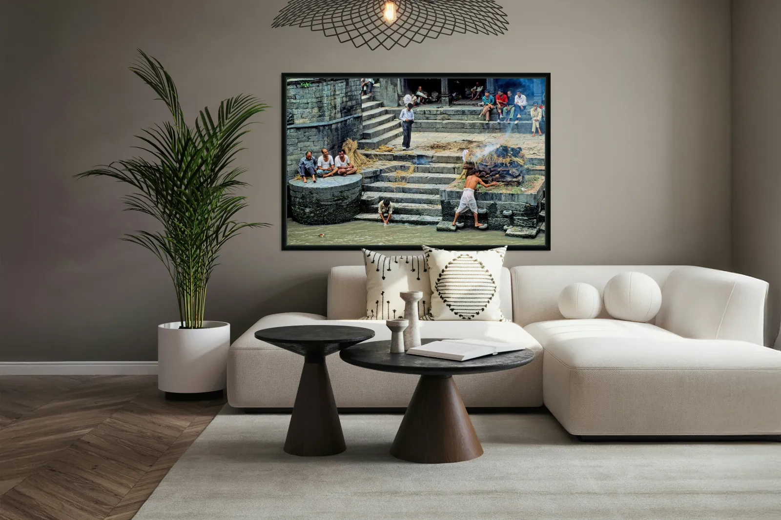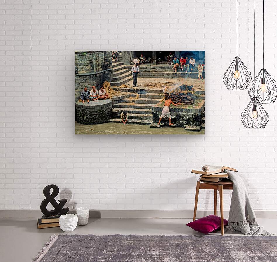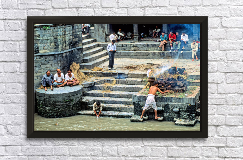 "Cremation ritual at Pashupatinath in Kathmandu Nepal" in a framed print.
