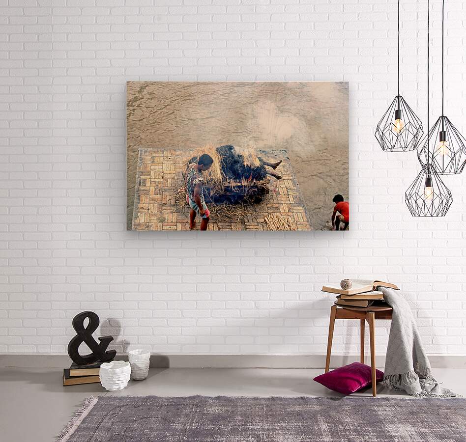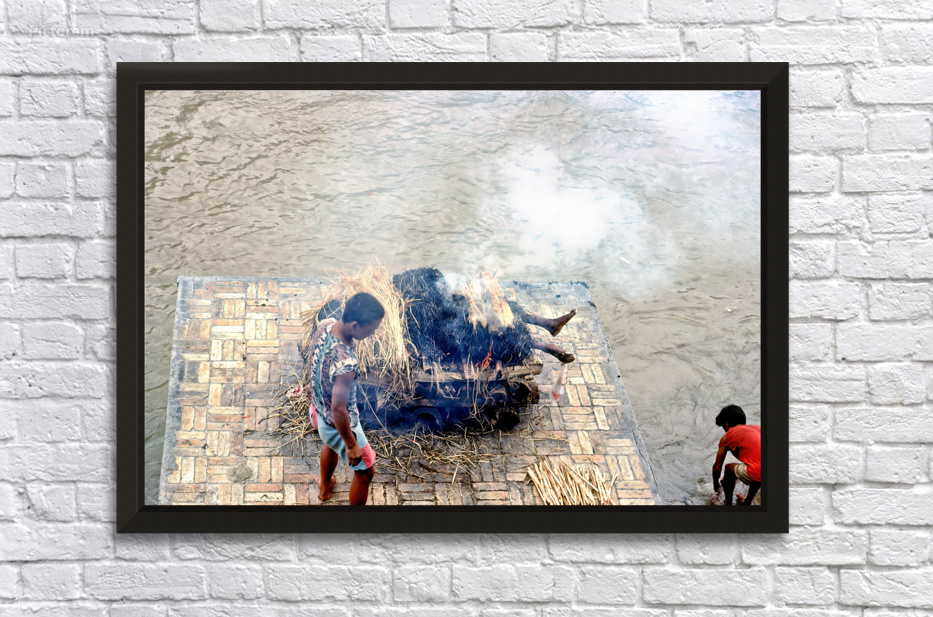 "Cremation ceremony in Pashupatinath Kathmandu Nepal" in a framed print.