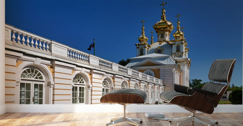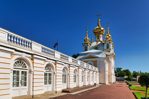 Visitors walk near the golden domes of Peterhof Palace in Saint Petersburg. The bright sky provides a clear view of the historic site.