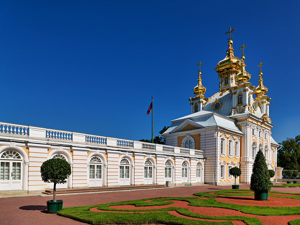 Visitors are seen walking around Peterhof Palace in St. Petersburg Russia on a sunny day.