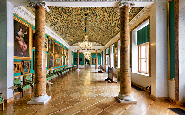 Visitors see the rich decor of Stroganov Palace with art and elegant design in Saint Petersburg in the afternoon.