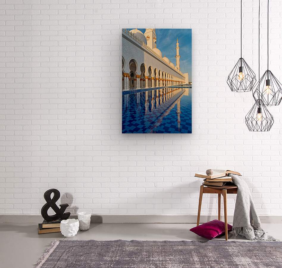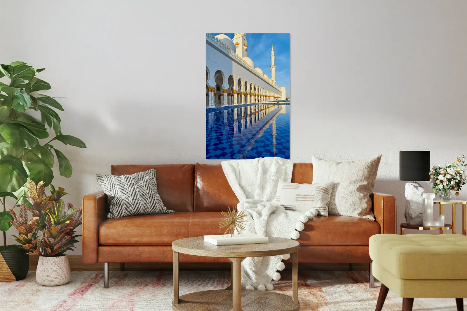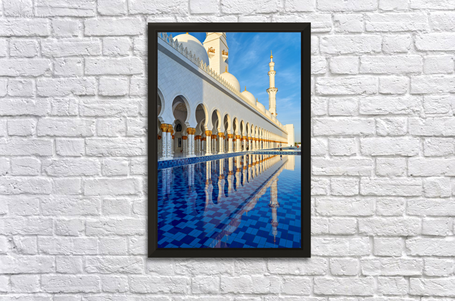 "Visit to Sheikh Zayed Grand Mosque in Abu Dhabi at dawn" in a framed print.