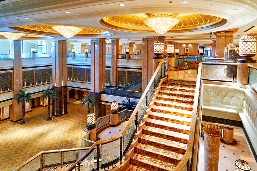 Visitors can see a grand staircase inside the Emirates Palace Hotel in Abu Dhabi. The space has large lights and decorative features.