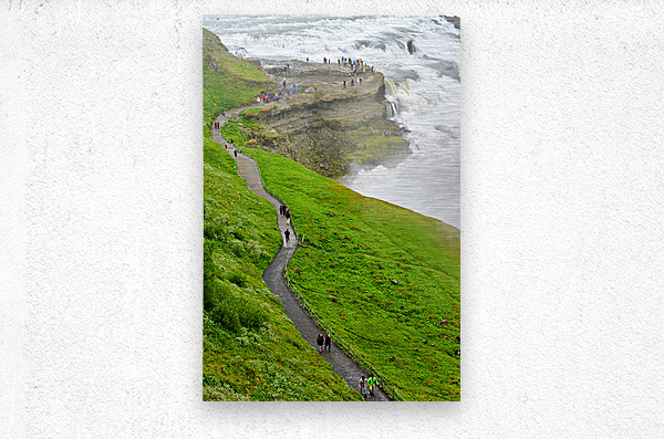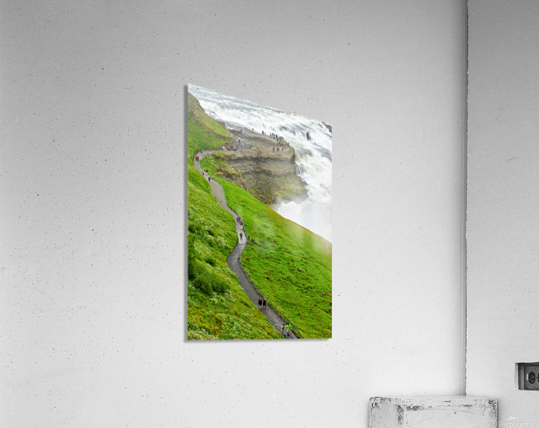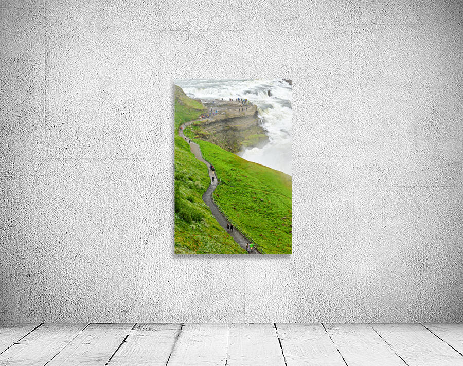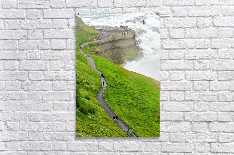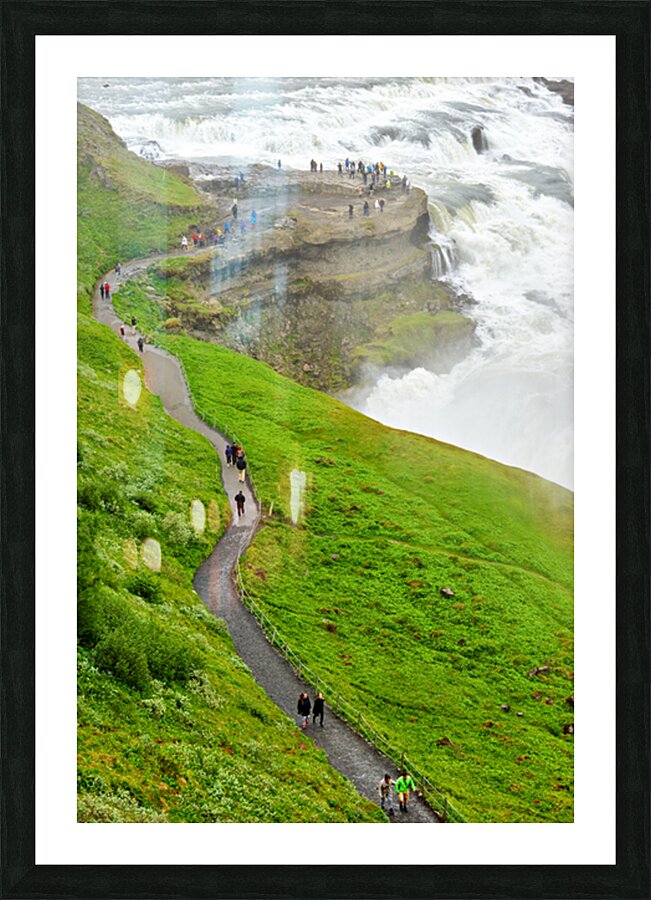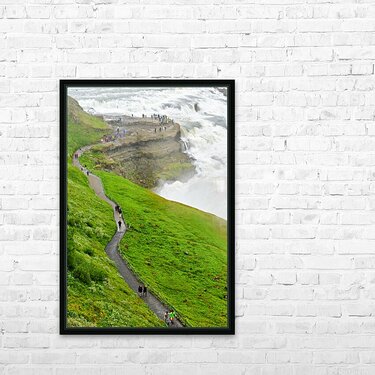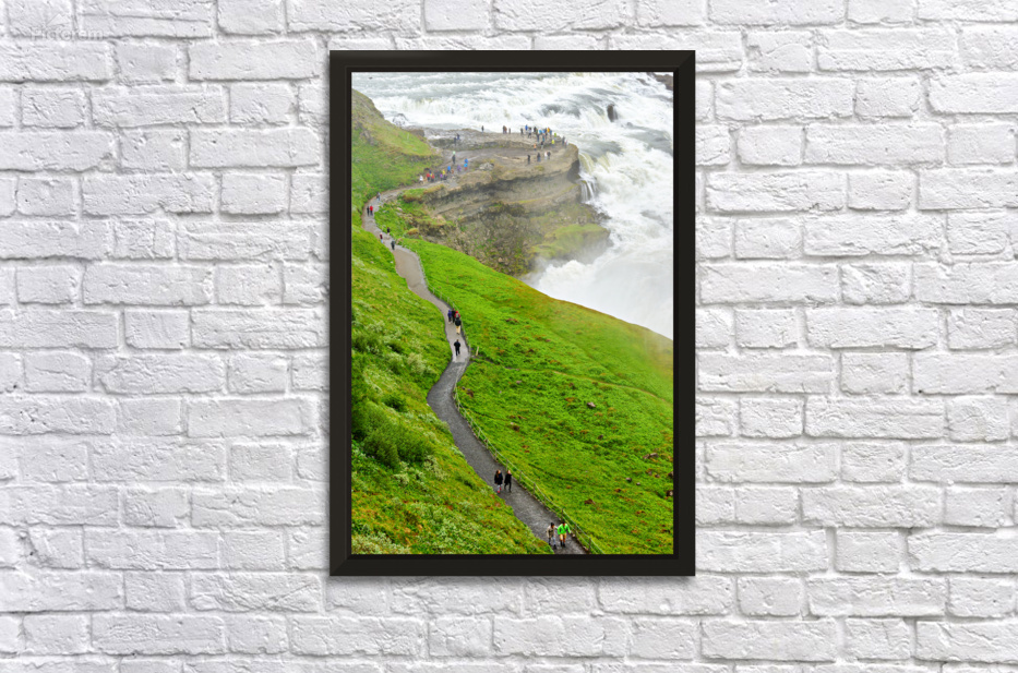 "Visitors explore Gullfoss waterfall in Iceland on a cloudy day" in a framed print.