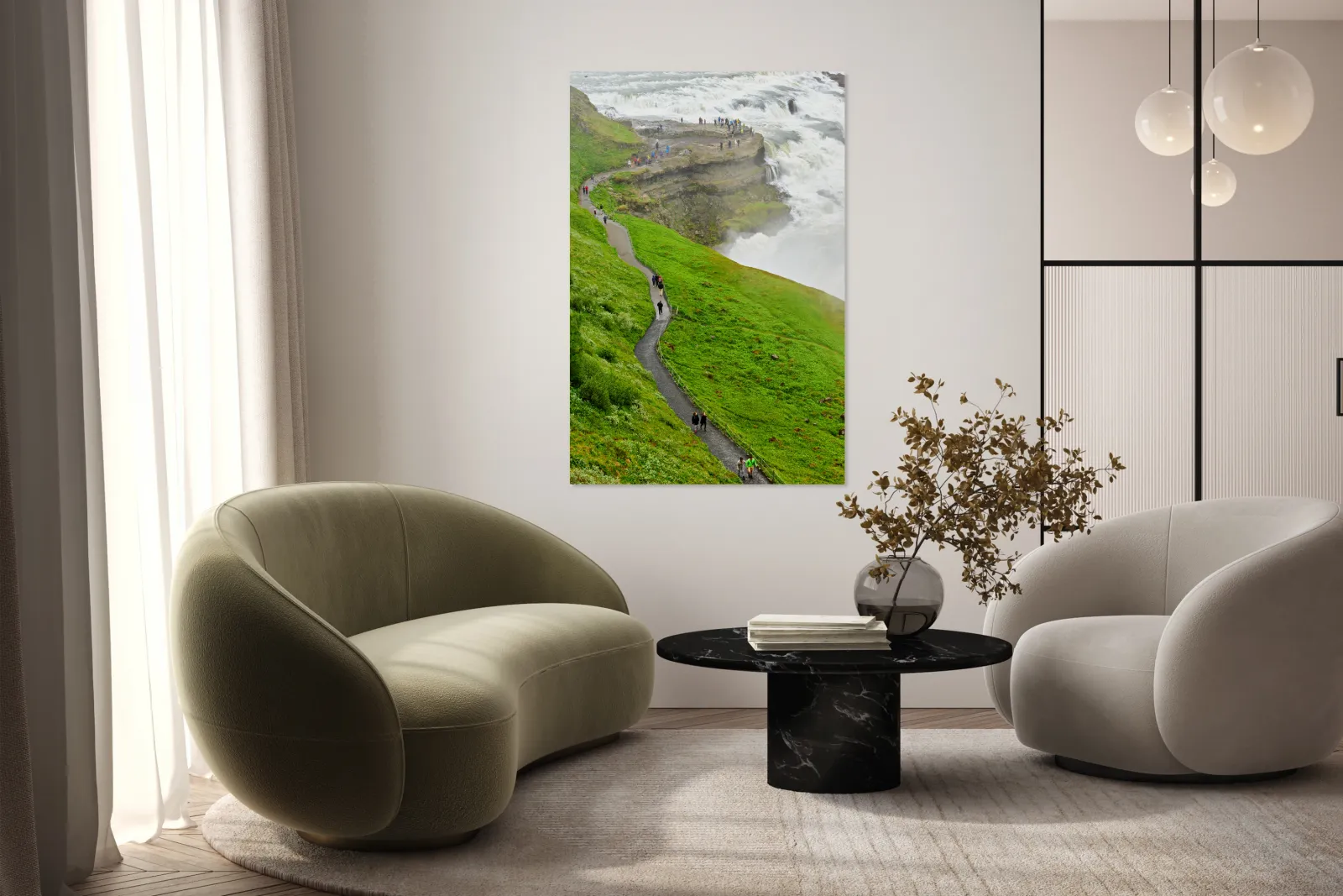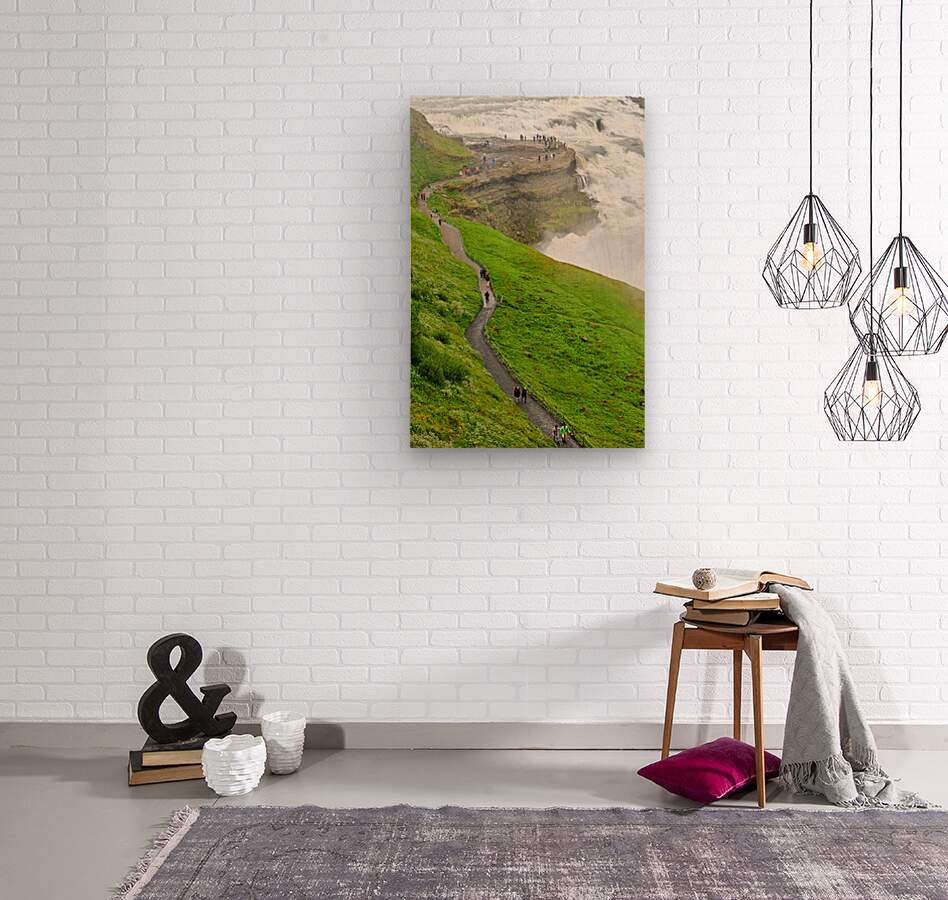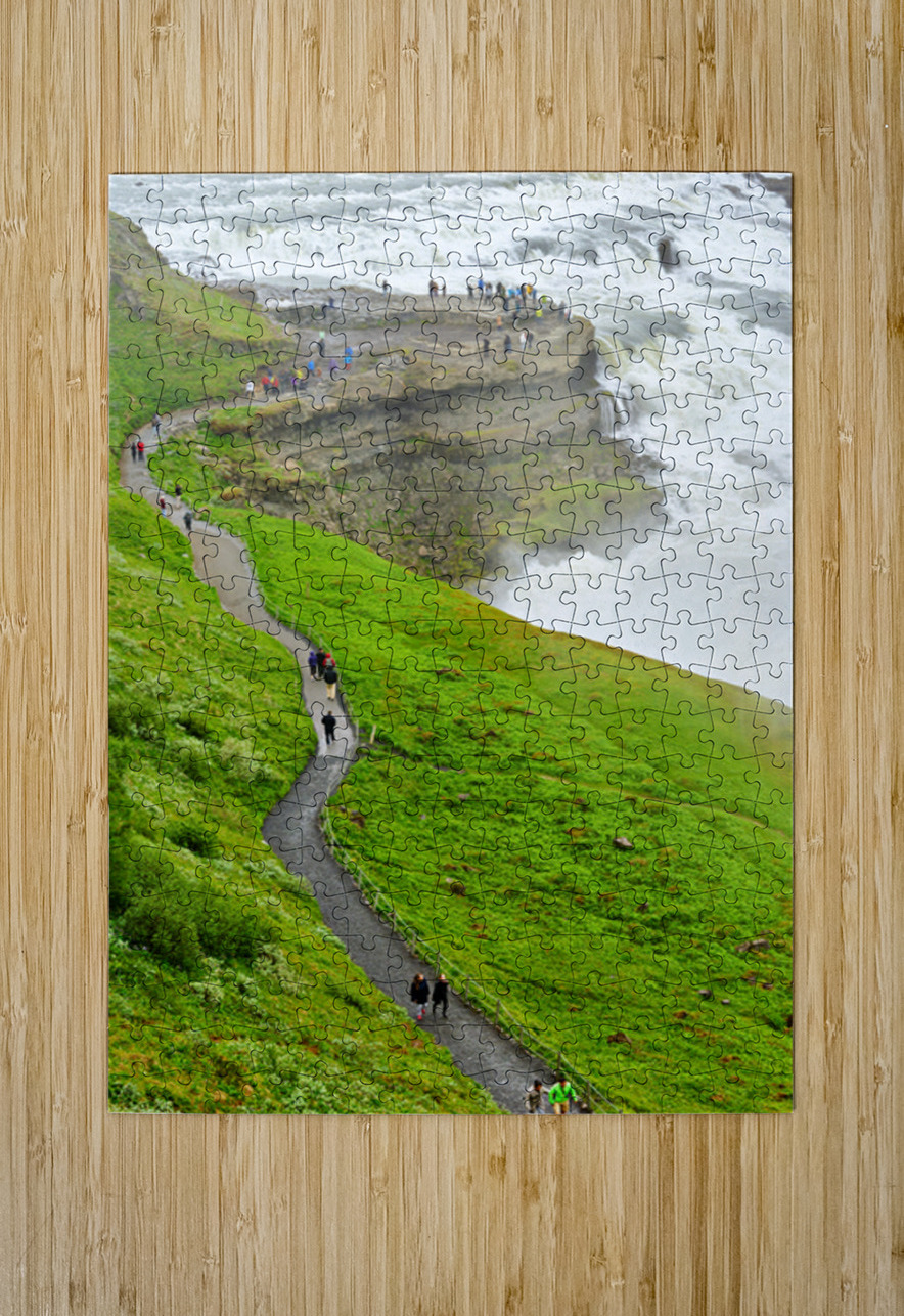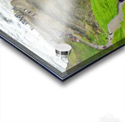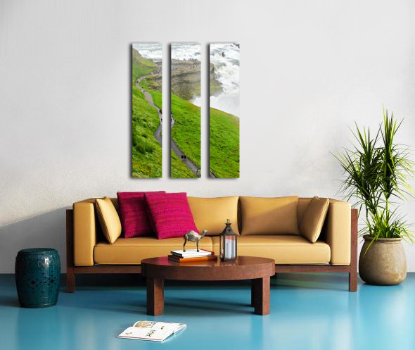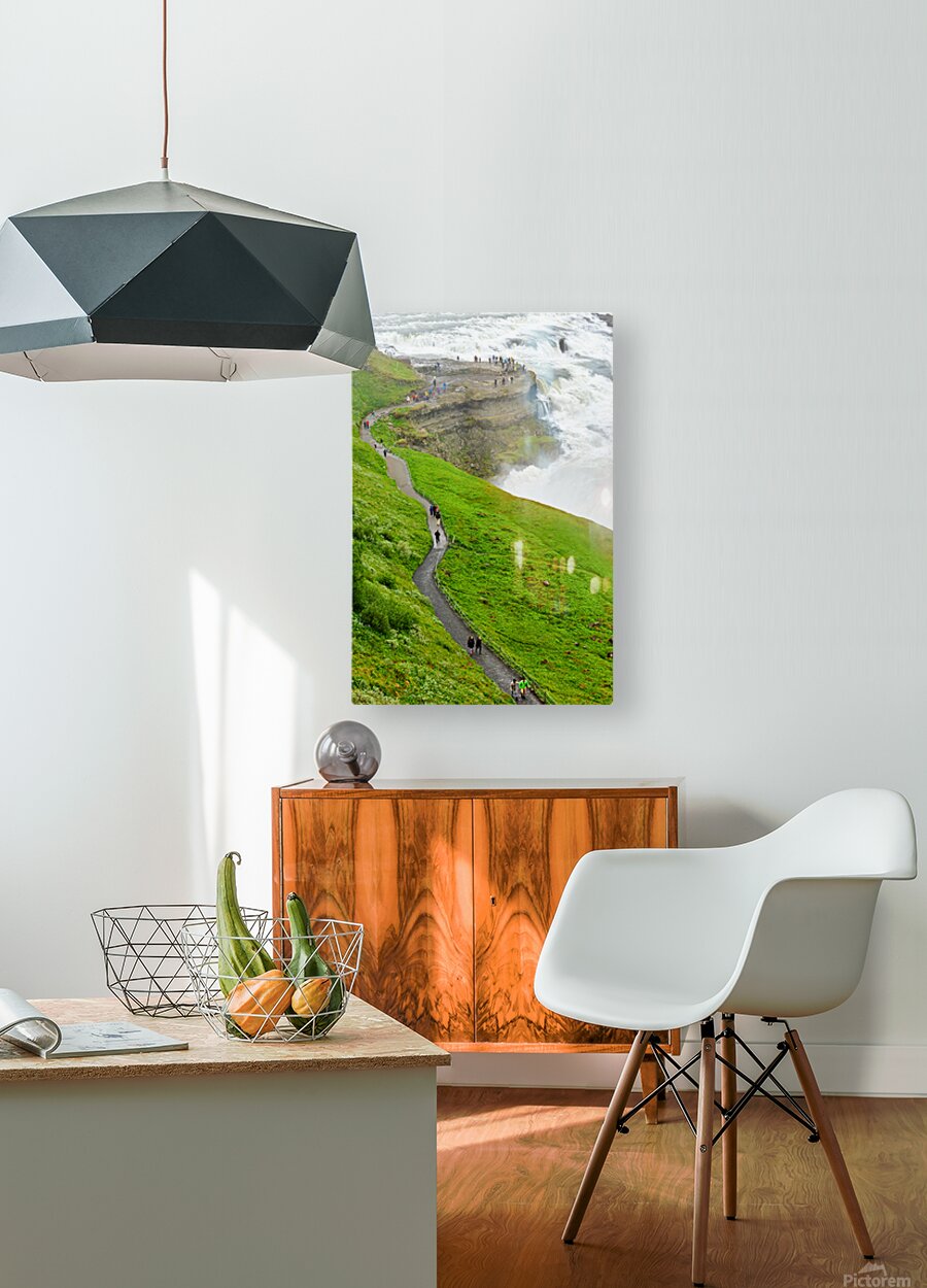 "Visitors explore Gullfoss waterfall in Iceland on a cloudy day" in a framed print.