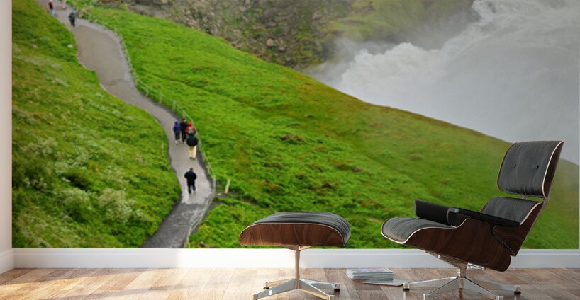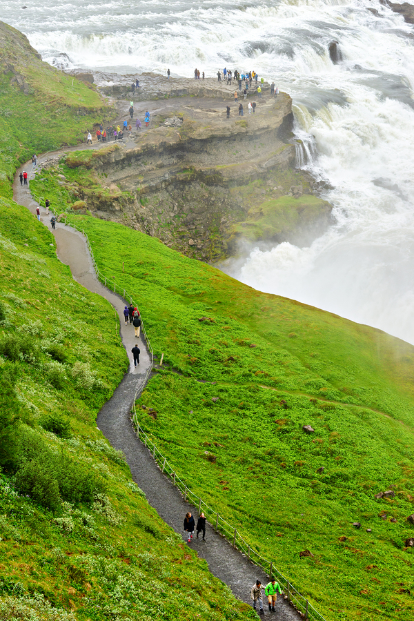 People walk along a path near Gullfoss waterfall in Iceland. The strong water flow creates mist above the cliff.