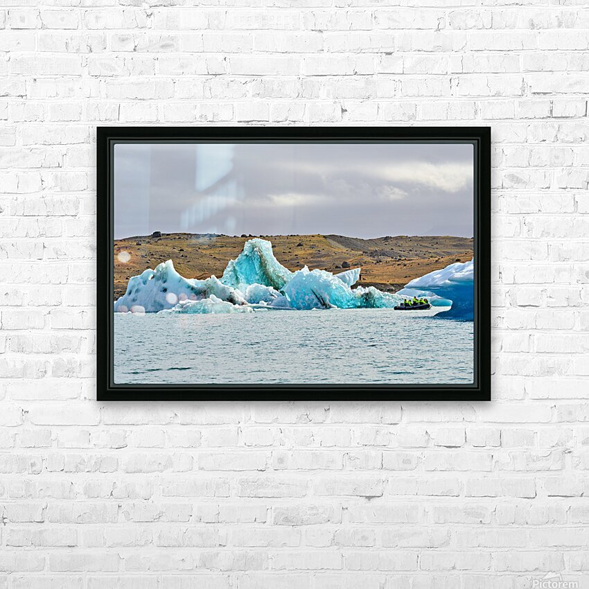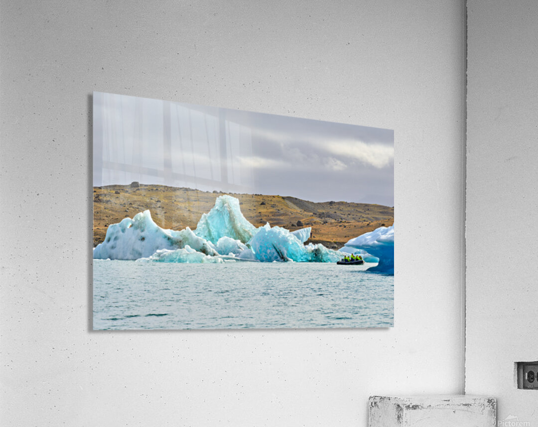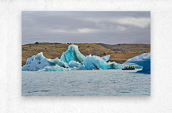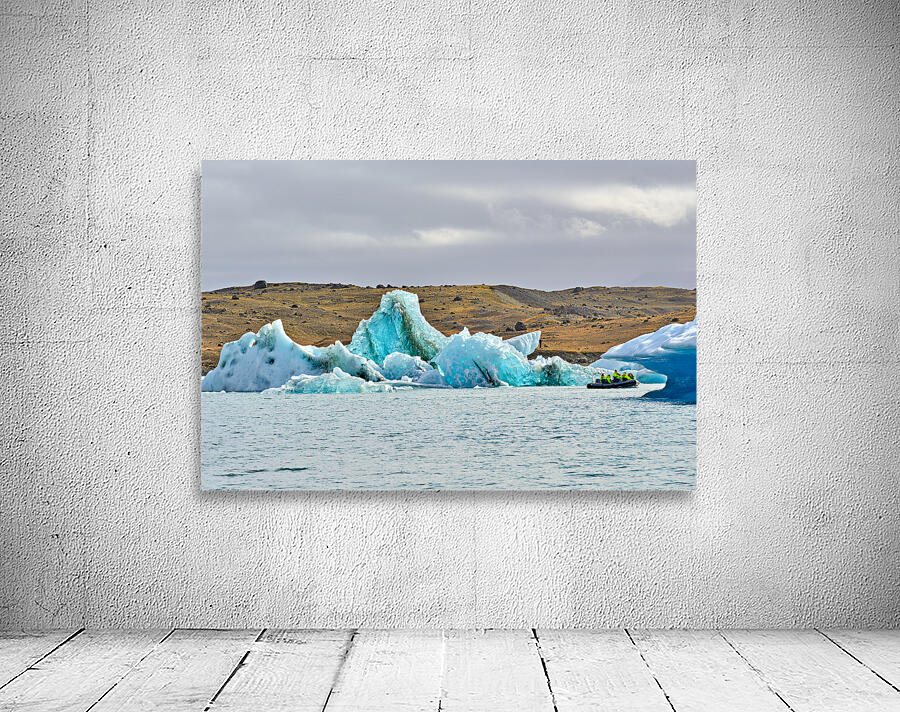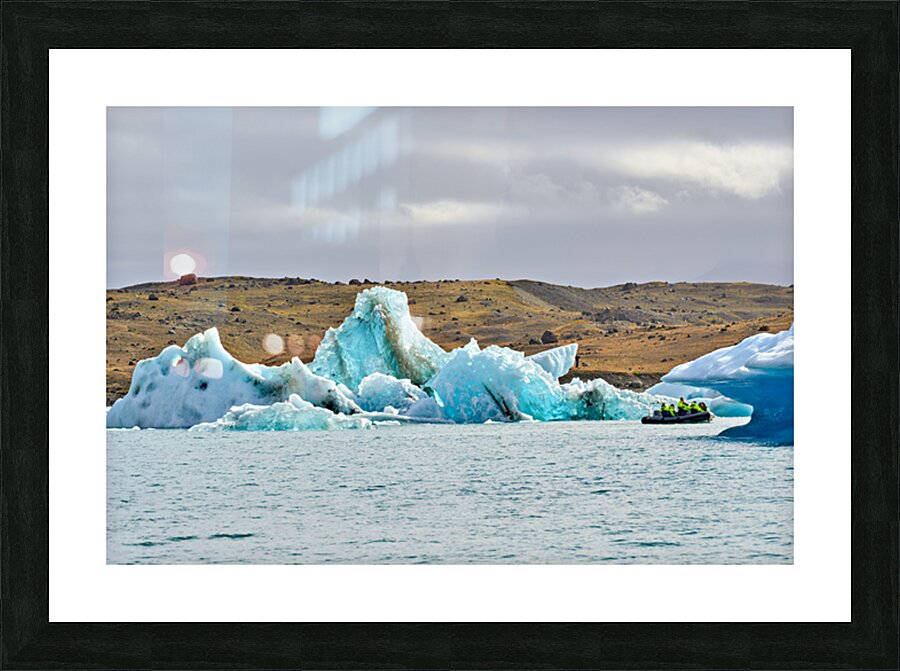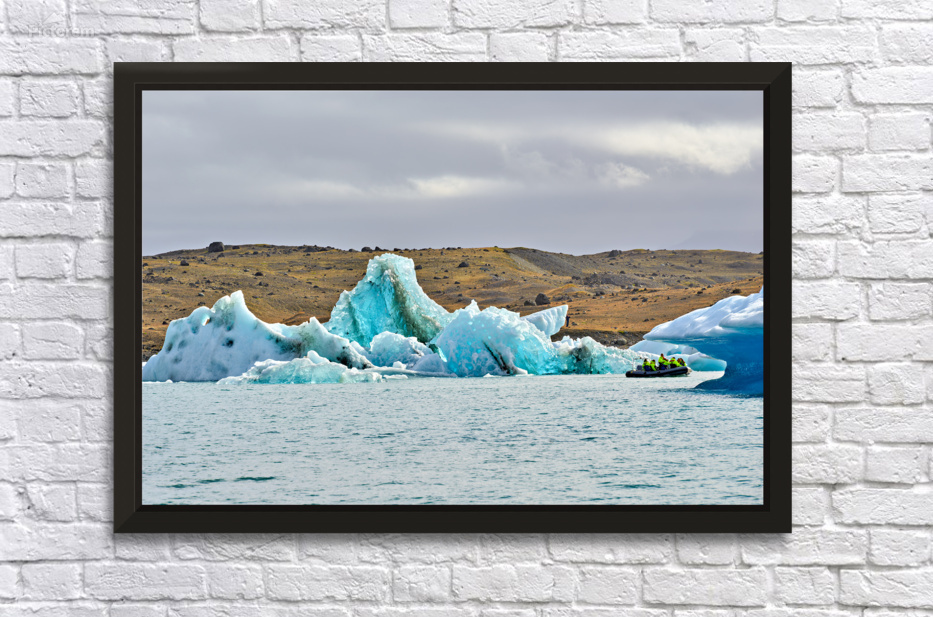"Tourists explore Jokulsarlon glacier lagoon in Iceland" in a framed print.