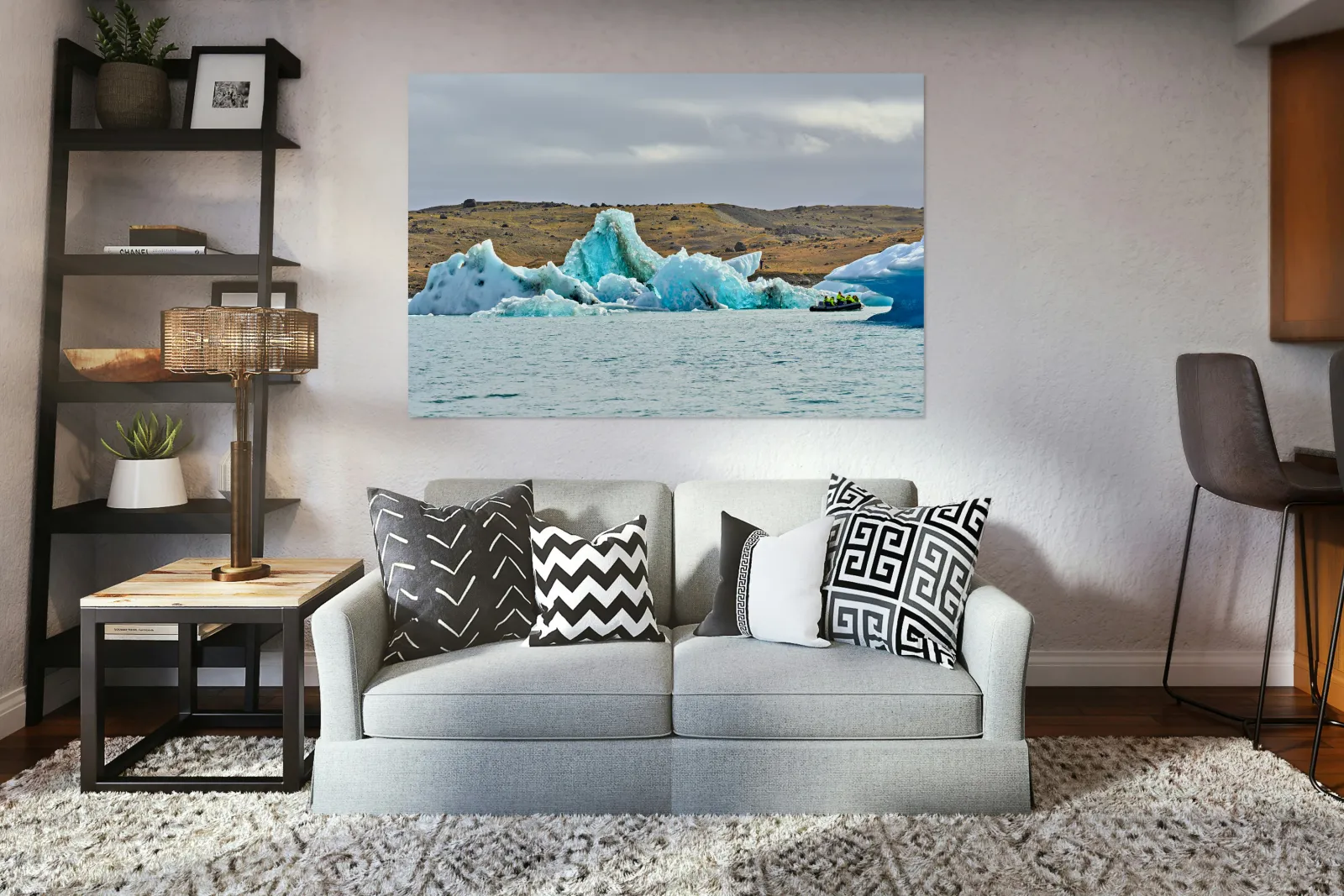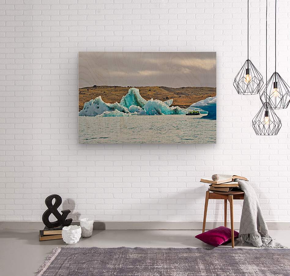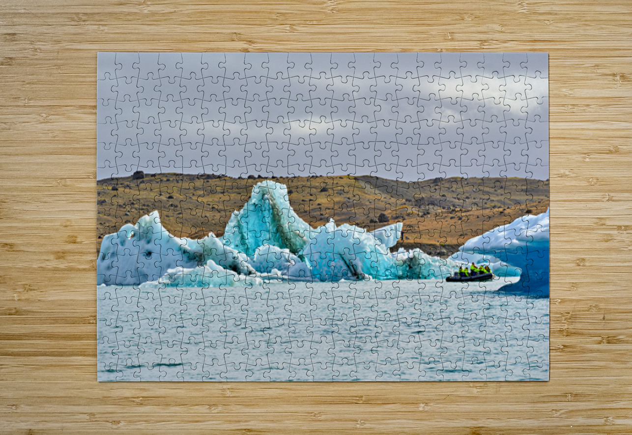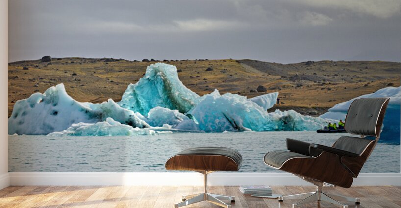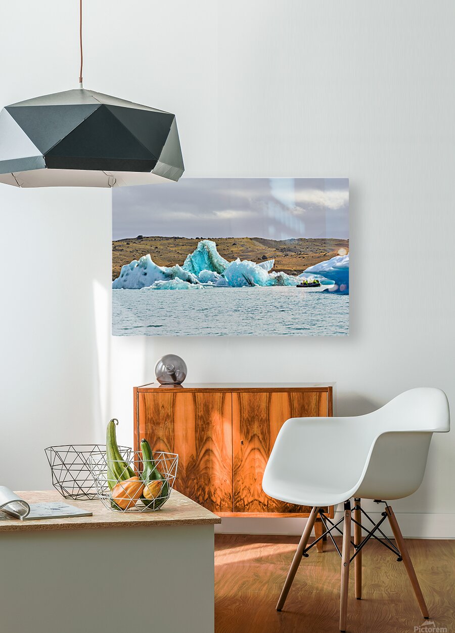"Tourists explore Jokulsarlon glacier lagoon in Iceland" in a framed print.
