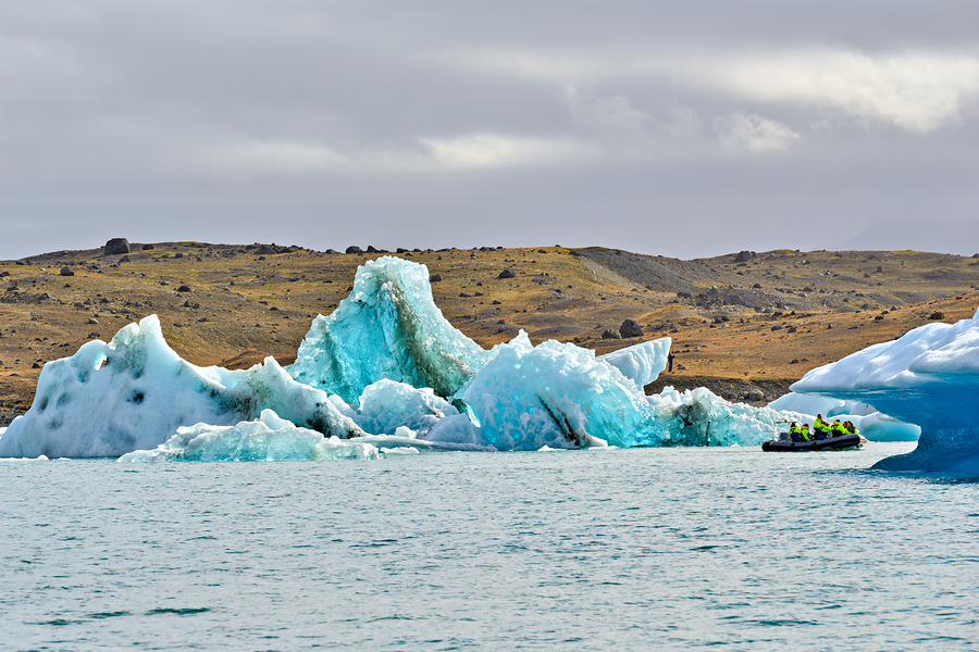 Tourists in a small boat navigate through icebergs at Jokulsarlon glacier lagoon in Iceland under a cloudy sky.