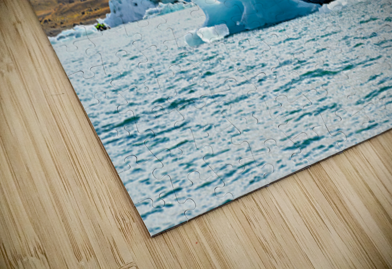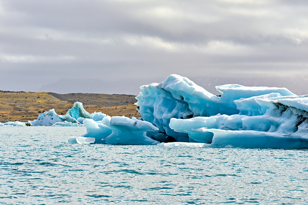 Visitors view large ice formations in Jokulsarlon Glacier Lagoon in Iceland. Dark clouds cover the sky as the water surrounds the ice.