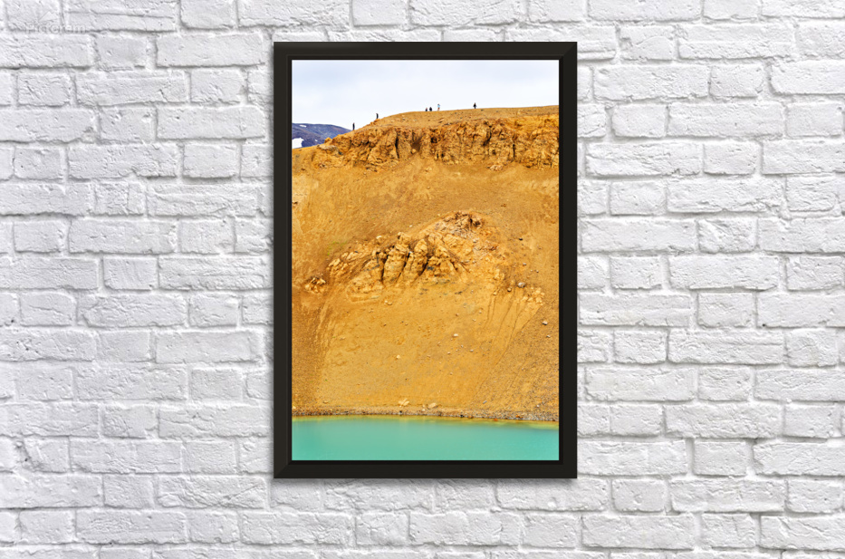 "Visitors exploring the Krafla caldera in Iceland" in a framed print.