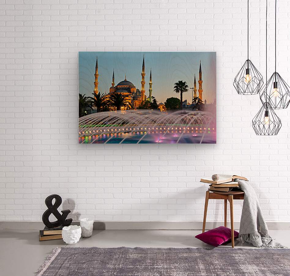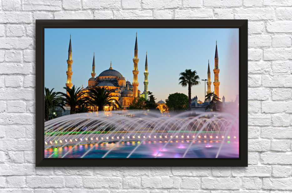 "Visit to Blue Mosque and fountain at twilight in Istanbul" in a framed print.