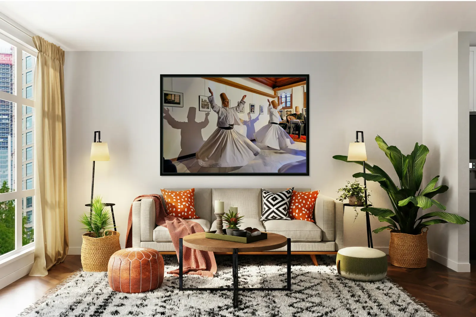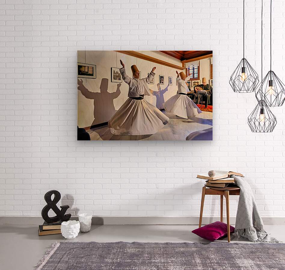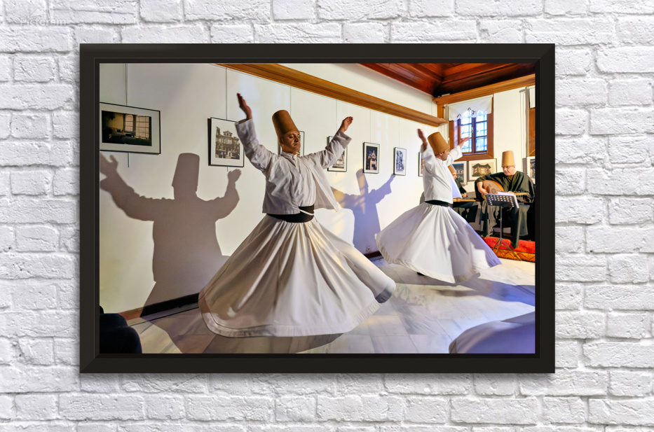 "Whirling dervishes perform at sufi event in Istanbul Turkey" in a framed print.