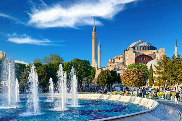 Visitors gather around the fountain near Hagia Sophia Grand Mosque in Istanbul on a clear day with bright blue sky.