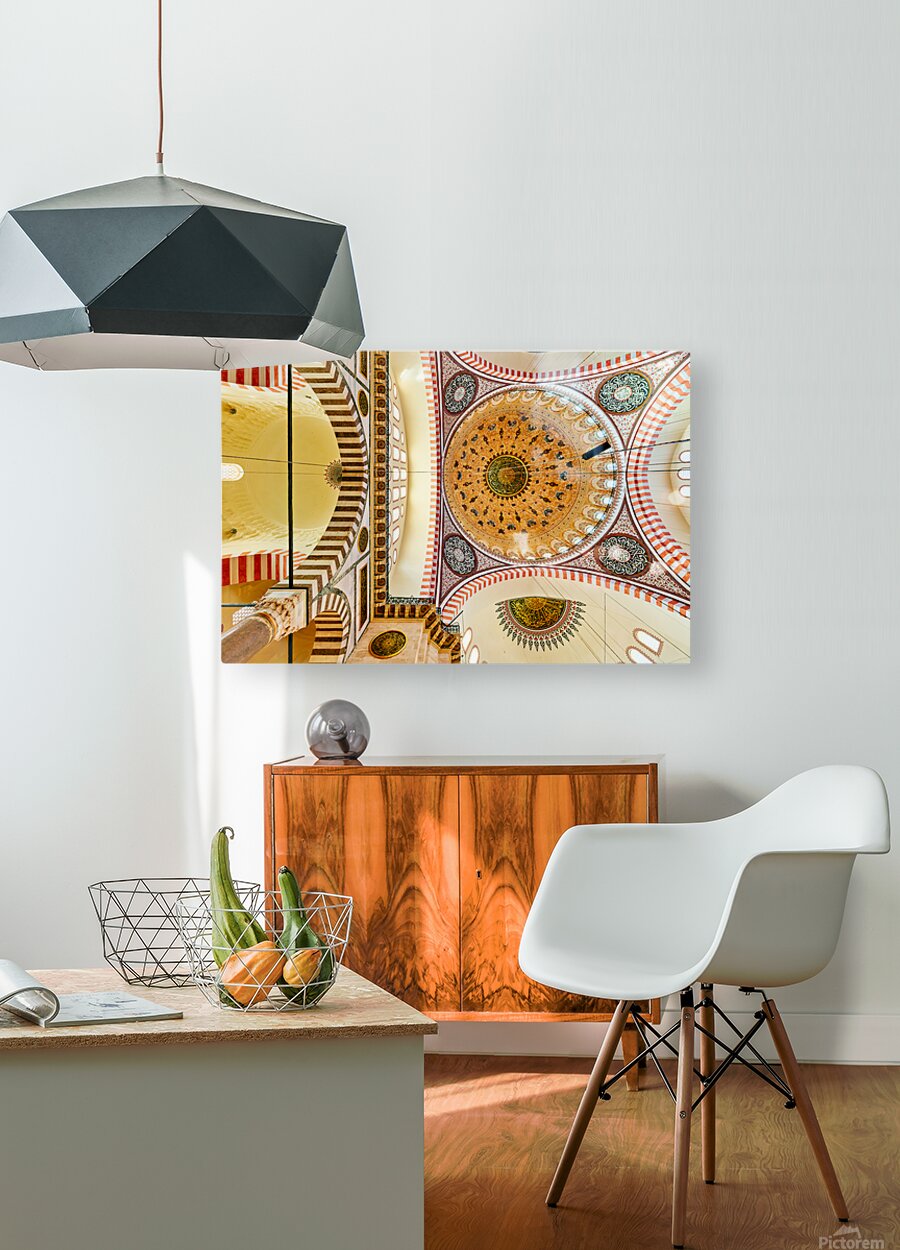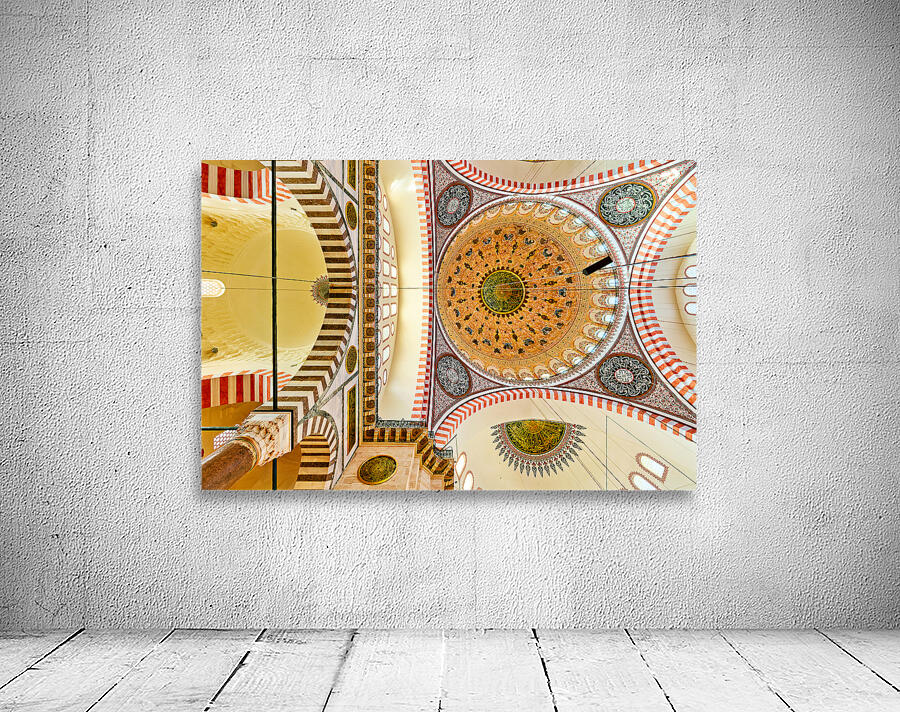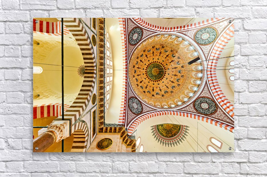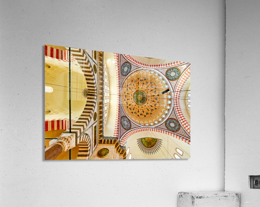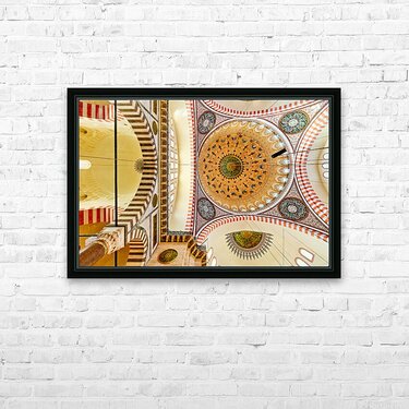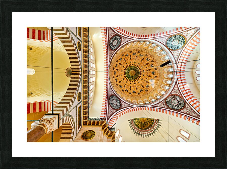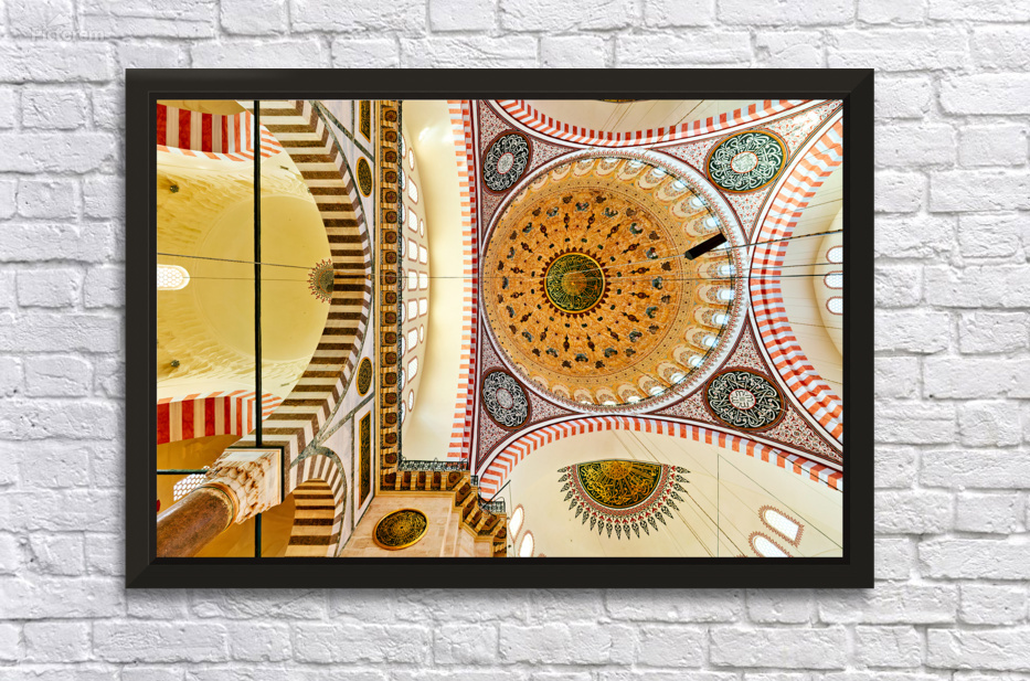 "Suleymaniye Mosque ceiling shows dome and architecture details" in a framed print.