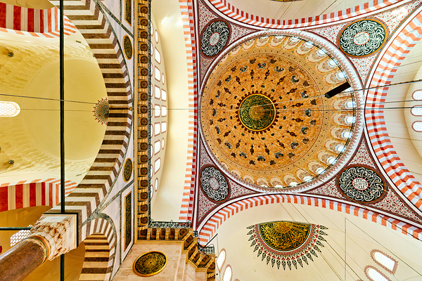 Visitors look up at the ornate ceiling of Suleymaniye Mosque in Istanbul appreciating the design and detail of this historical site.