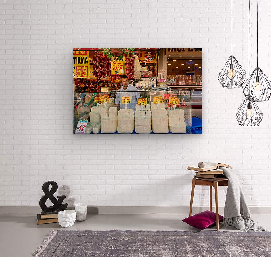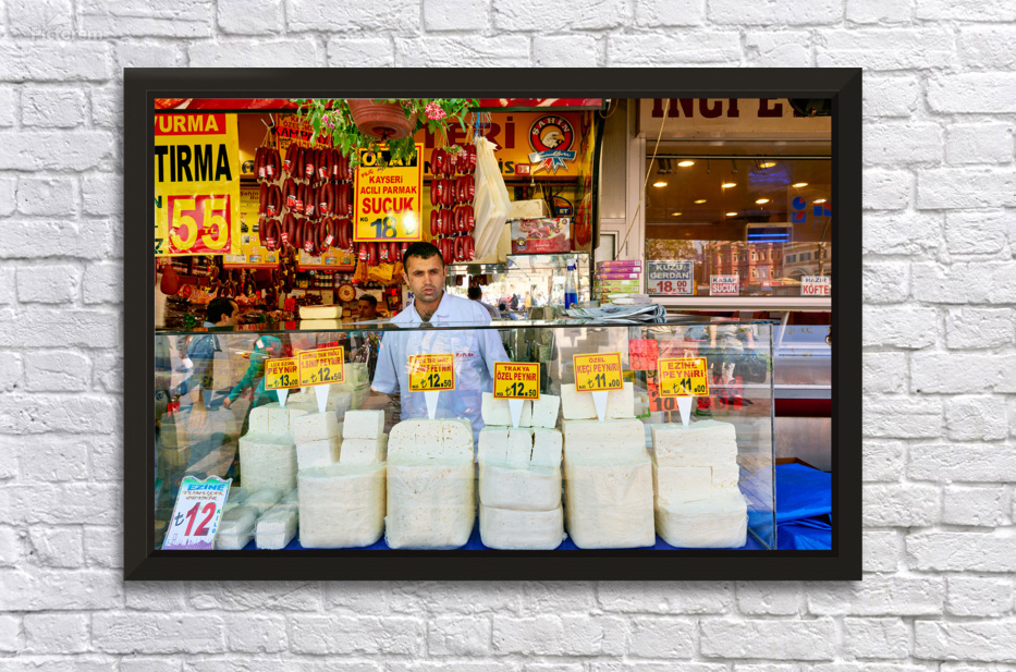 "Cheese vendor at Grand Bazaar in Istanbul during busy hours" in a framed print.